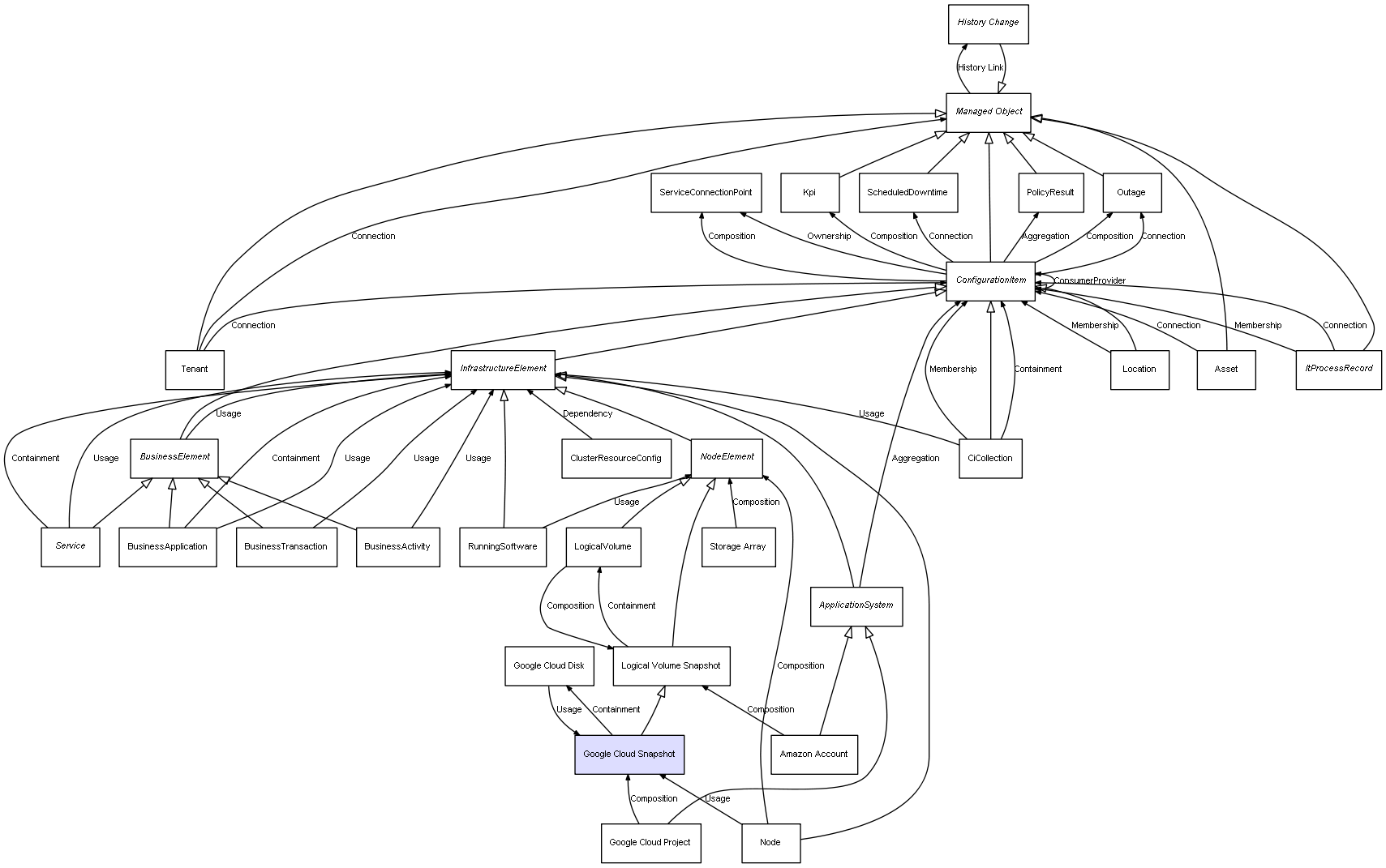| Google Cloud Project | Google Cloud Snapshot | Composition | Represents a relation between 2 objects where one is contained within the other, and the included object can not exist without its container. Therefore, when the container is deleted, all its contained object will be automatically removed |