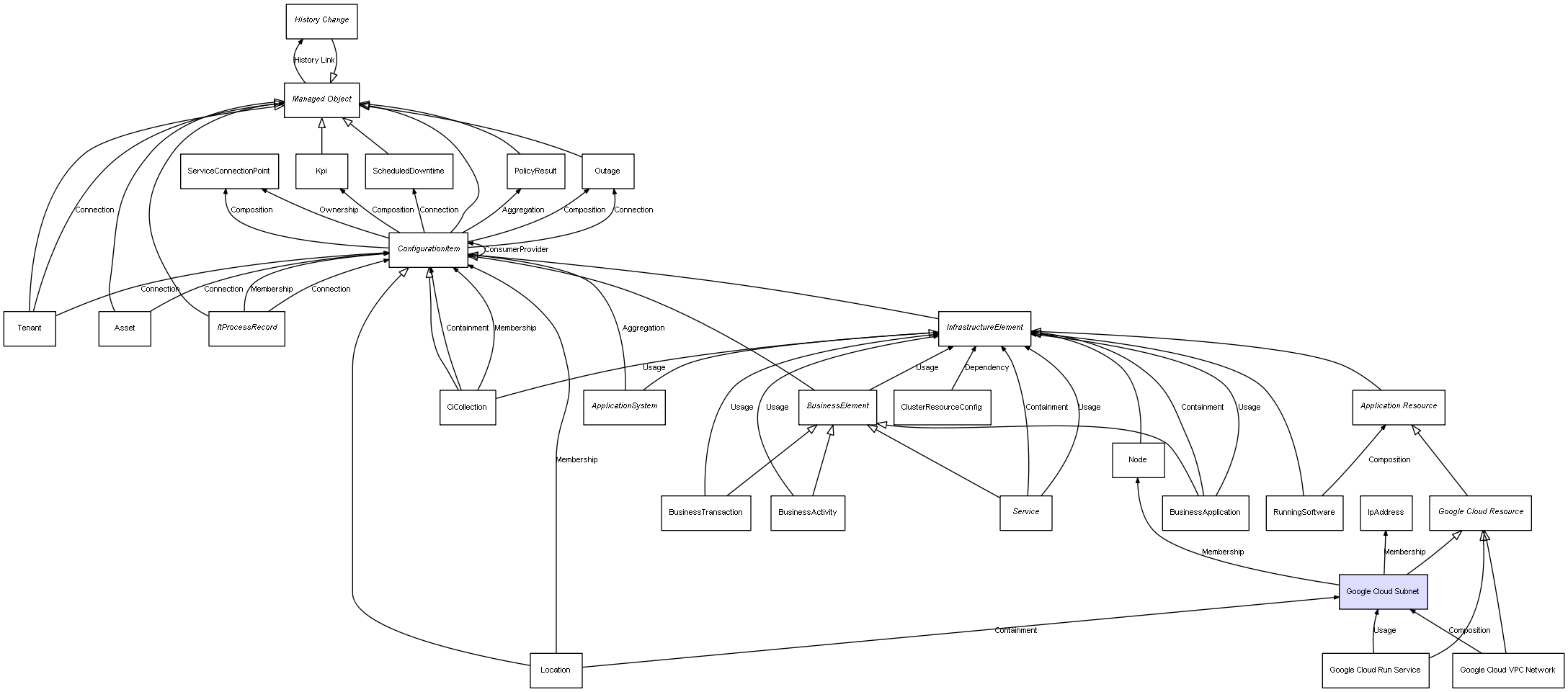 | Google Cloud VPC Network | Google Cloud Subnet | Composition | Represents a relation between 2 objects where one is contained within the other, and the included object can not exist without its container. Therefore, when the container is deleted, all its contained object will be automatically removed |