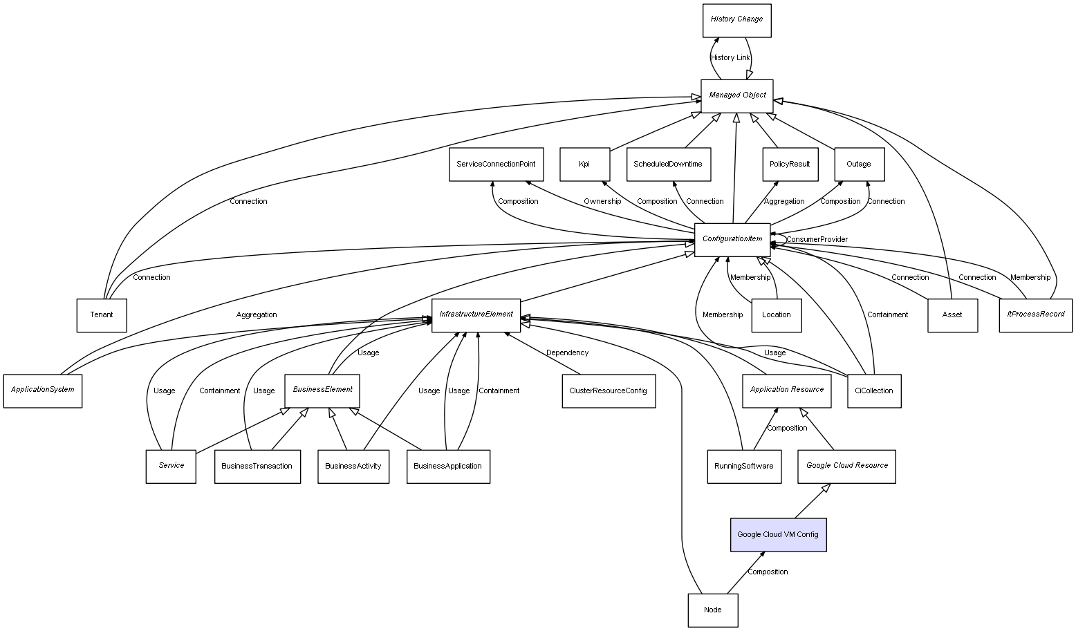 | Node | Google Cloud VM Config | Composition | Represents a relation between 2 objects where one is contained within the other, and the included object can not exist without its container. Therefore, when the container is deleted, all its contained object will be automatically removed |