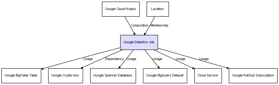 | Google Cloud Project | Google Dataflow Job | Composition | Represents a relation between 2 objects where one is contained within the other, and the included object can not exist without its container. Therefore, when the container is deleted, all its contained object will be automatically removed |