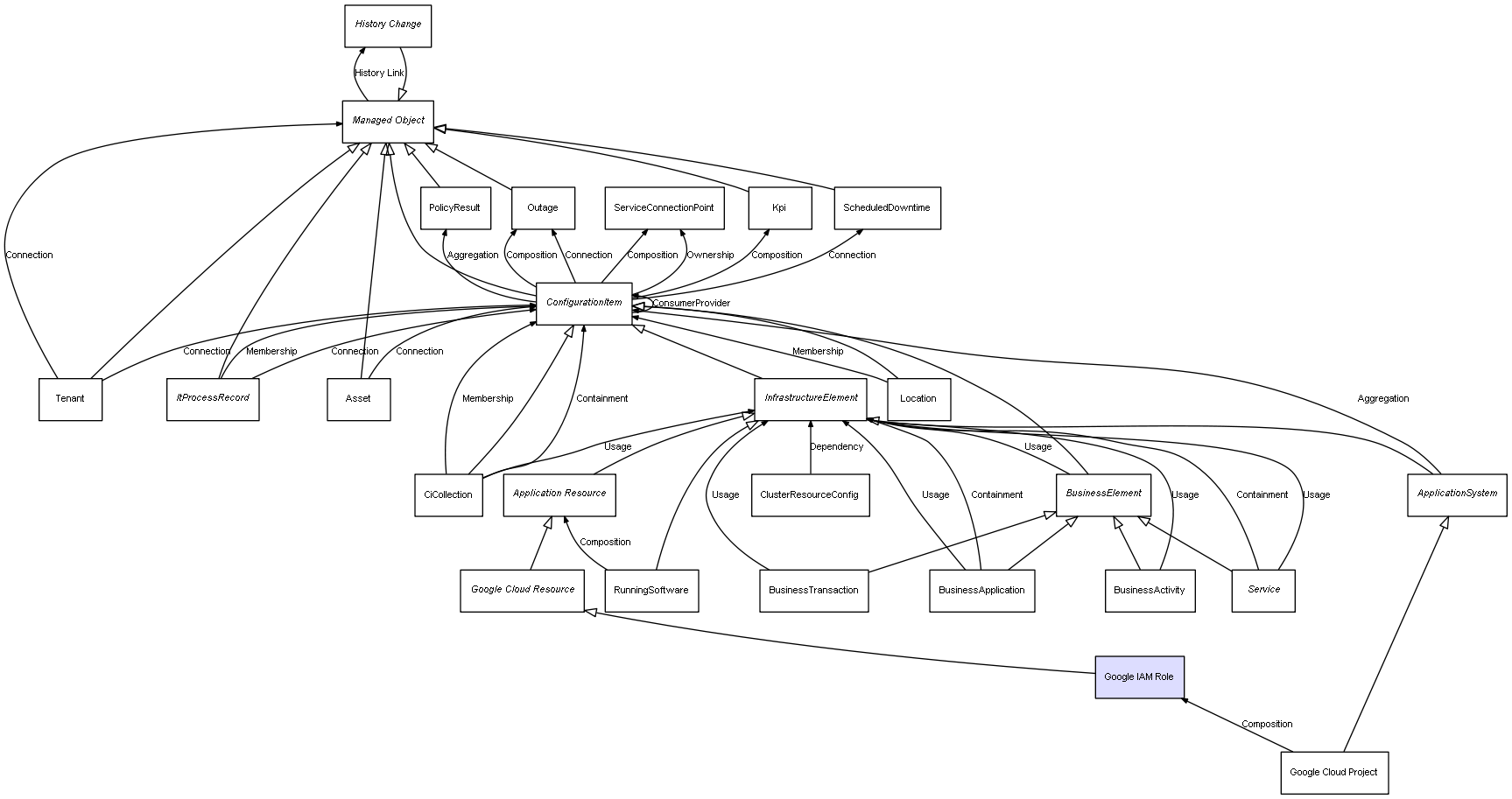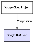 | Google Cloud Project | Google IAM Role | Composition | Represents a relation between 2 objects where one is contained within the other, and the included object can not exist without its container. Therefore, when the container is deleted, all its contained object will be automatically removed |