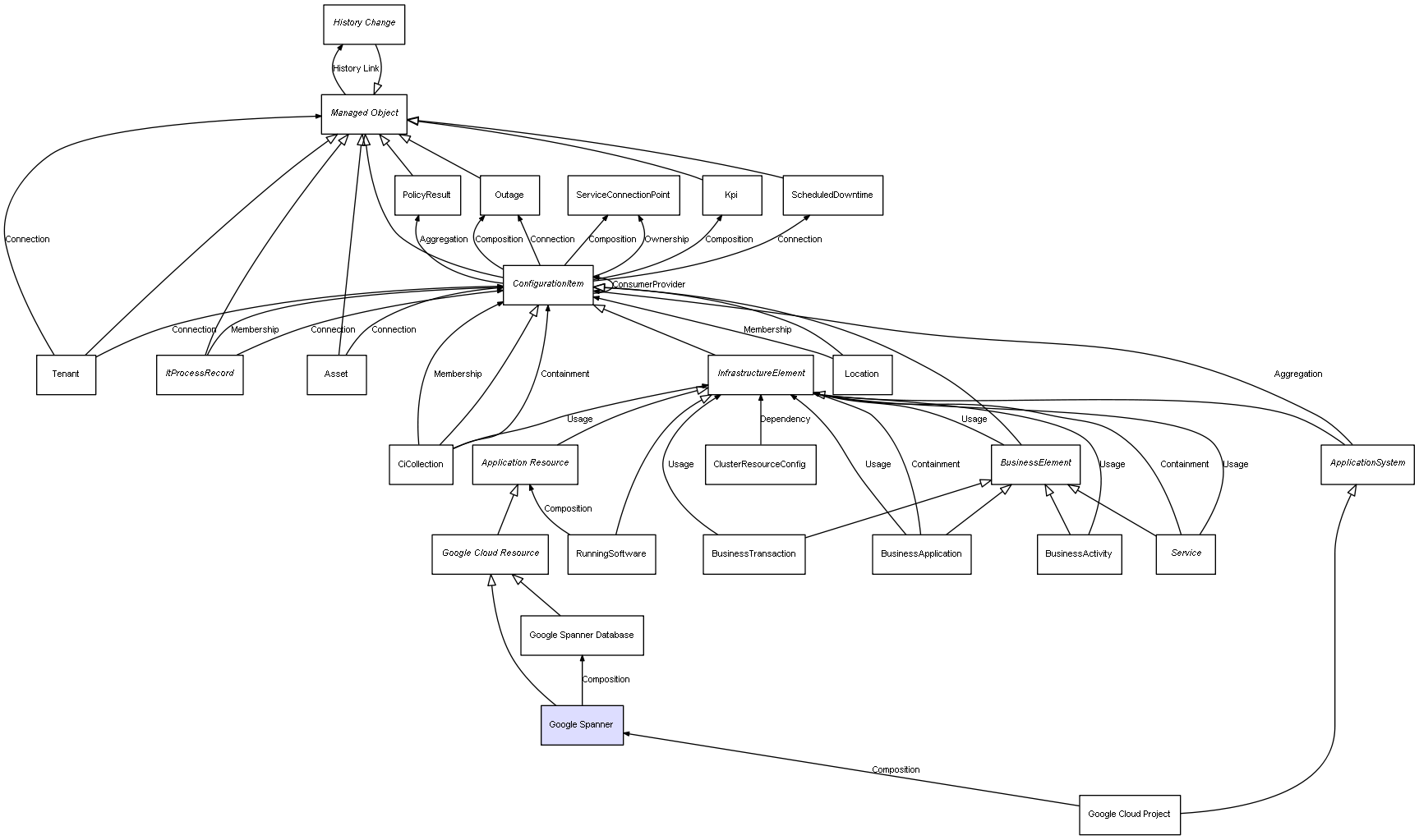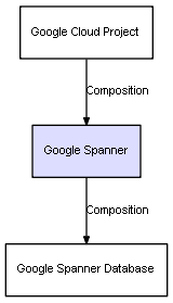 | Google Spanner | Google Spanner Database | Composition | Represents a relation between 2 objects where one is contained within the other, and the included object can not exist without its container. Therefore, when the container is deleted, all its contained object will be automatically removed |