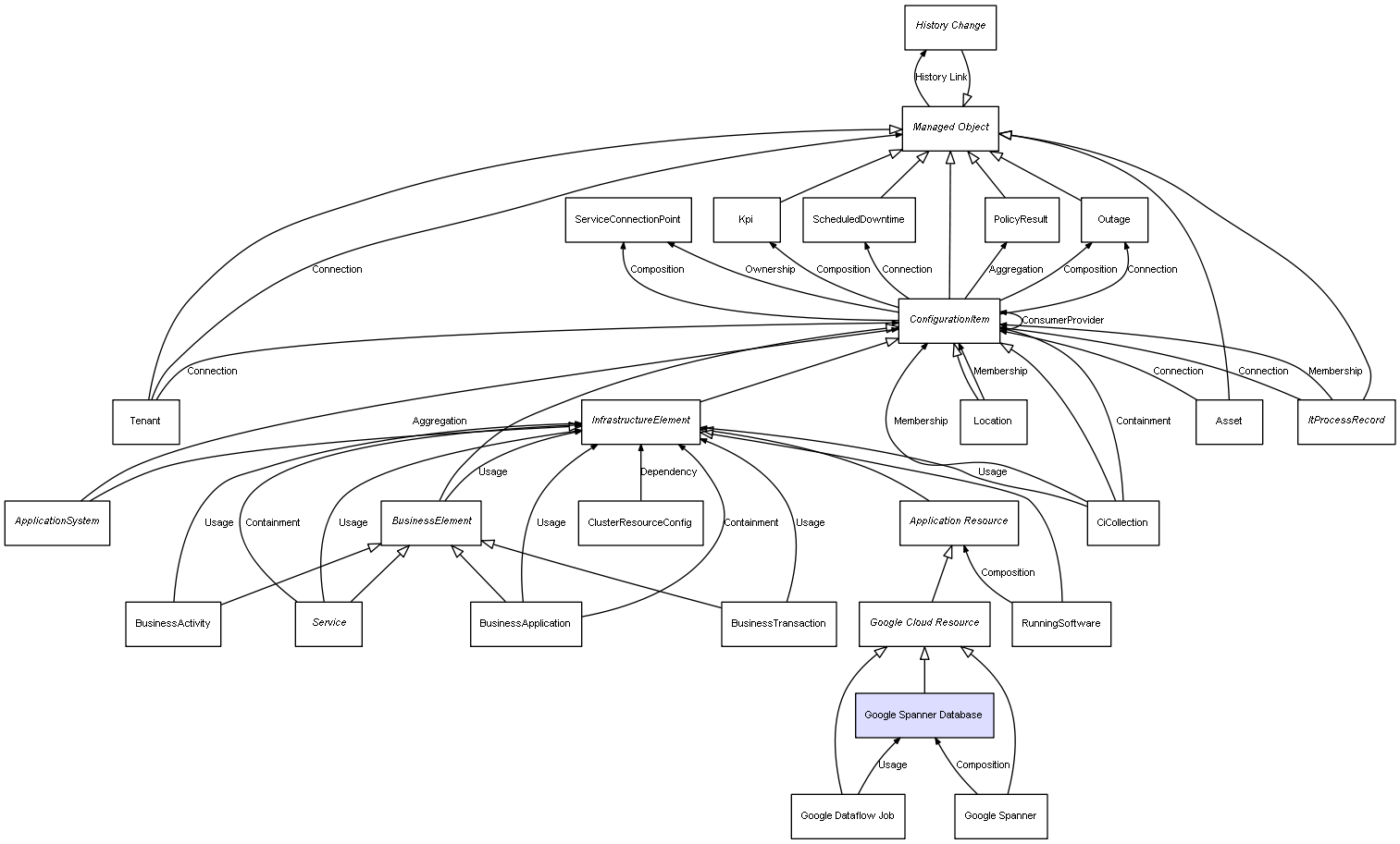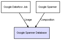 | Google Spanner | Google Spanner Database | Composition | Represents a relation between 2 objects where one is contained within the other, and the included object can not exist without its container. Therefore, when the container is deleted, all its contained object will be automatically removed |