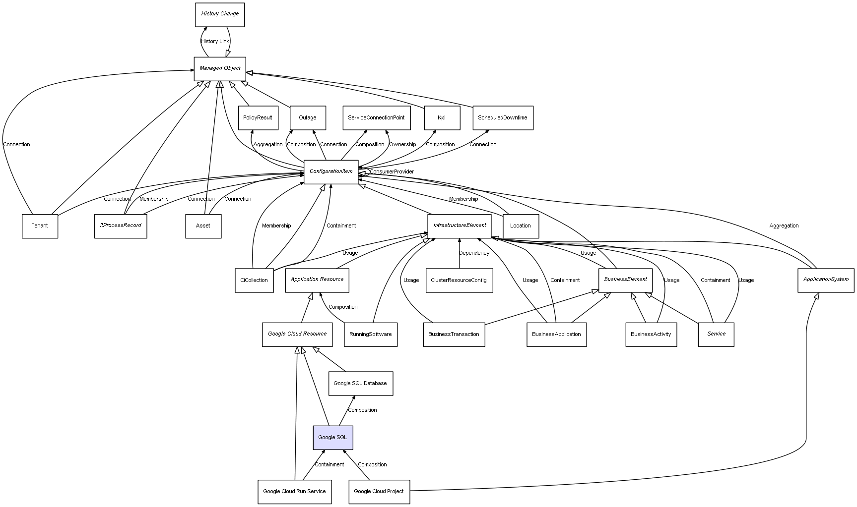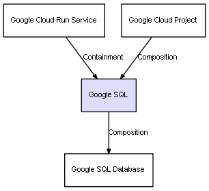 | Google Cloud Project | Google SQL | Composition | Represents a relation between 2 objects where one is contained within the other, and the included object can not exist without its container. Therefore, when the container is deleted, all its contained object will be automatically removed |