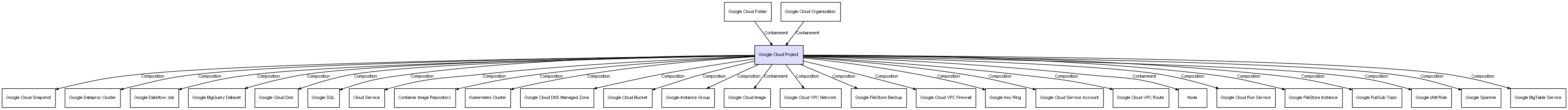 | Google Cloud Project | Cloud Service | Composition | Represents a relation between 2 objects where one is contained within the other, and the included object can not exist without its container. Therefore, when the container is deleted, all its contained object will be automatically removed |