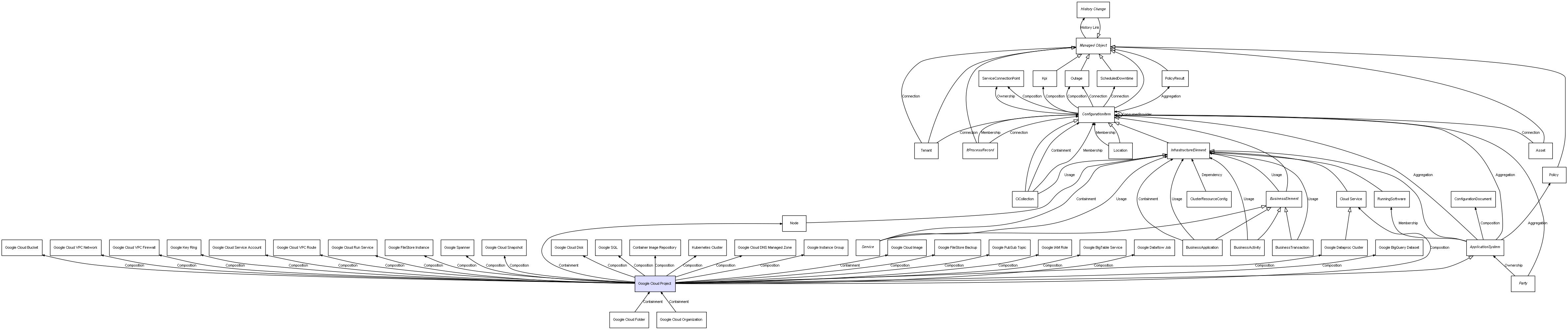 | Google Cloud Project | Google Cloud Bucket | Composition | Represents a relation between 2 objects where one is contained within the other, and the included object can not exist without its container. Therefore, when the container is deleted, all its contained object will be automatically removed |