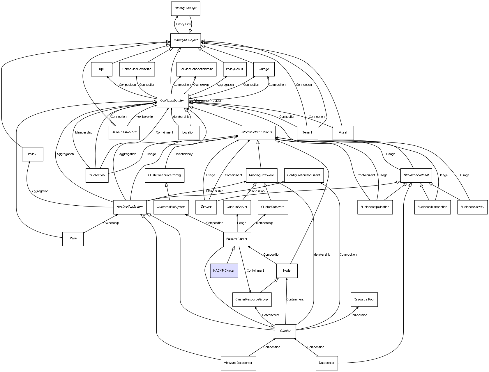| Cluster | ConfigurationDocument | Composition | Represents a relation between 2 objects where one is contained within the other, and the included object can not exist without its container. Therefore, when the container is deleted, all its contained object will be automatically removed |