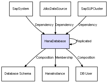 | HanaDatabase | DB User | Composition | Represents a relation between 2 objects where one is contained within the other, and the included object can not exist without its container. Therefore, when the container is deleted, all its contained object will be automatically removed |