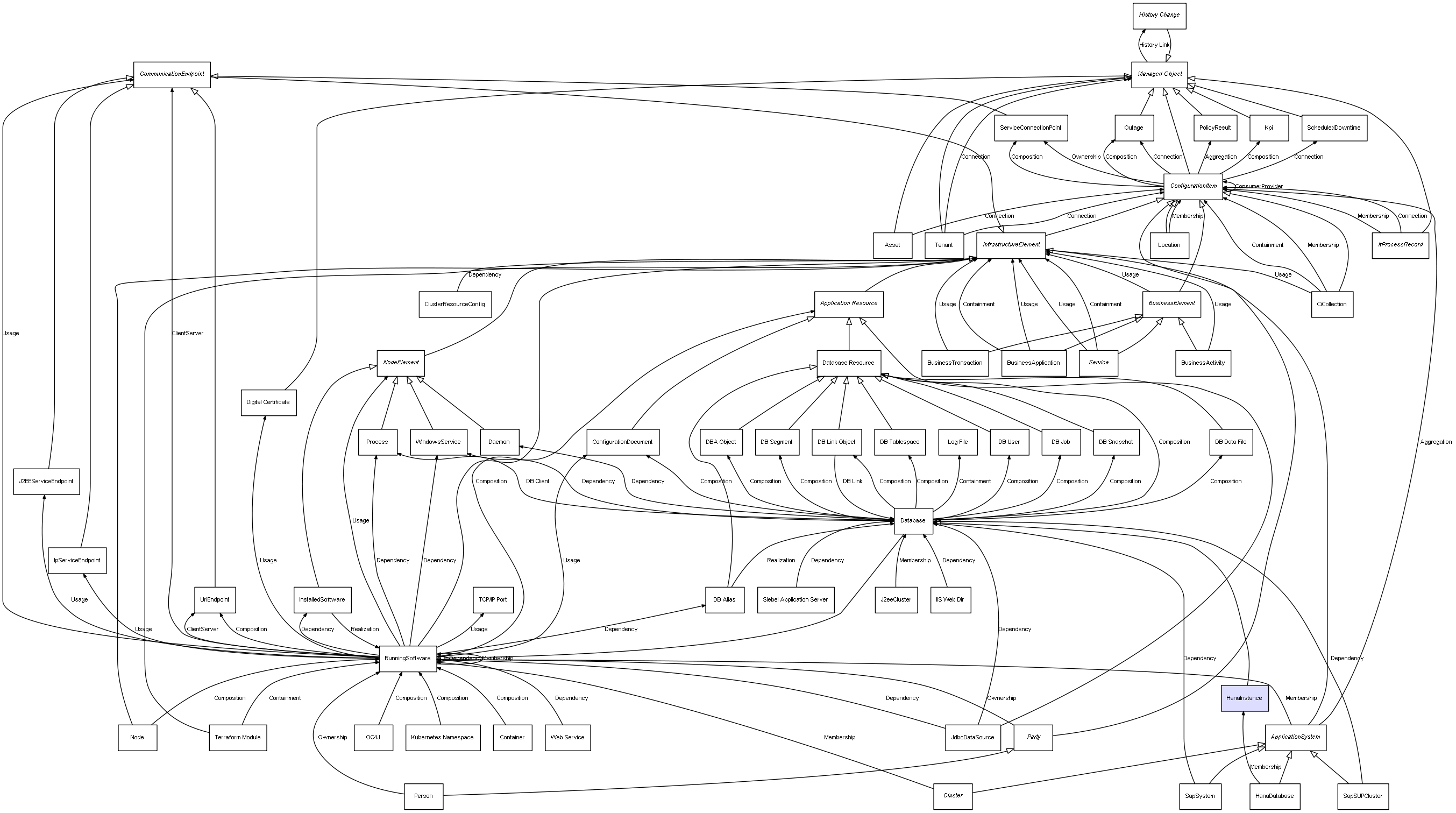 Combined inheritance and relation diagram for HanaInstance