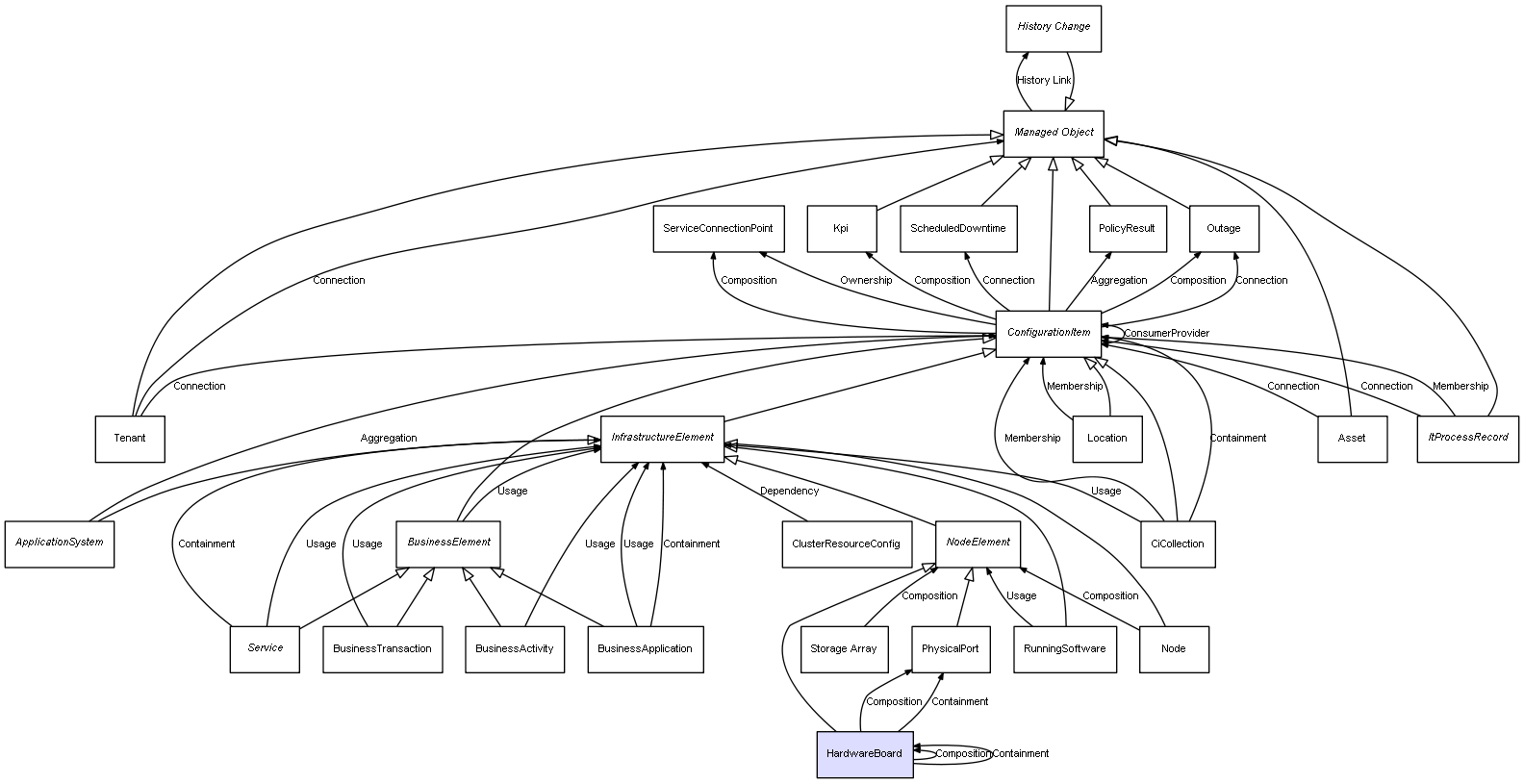 | ConfigurationItem | ServiceConnectionPoint | Composition | Represents a relation between 2 objects where one is contained within the other, and the included object can not exist without its container. Therefore, when the container is deleted, all its contained object will be automatically removed |