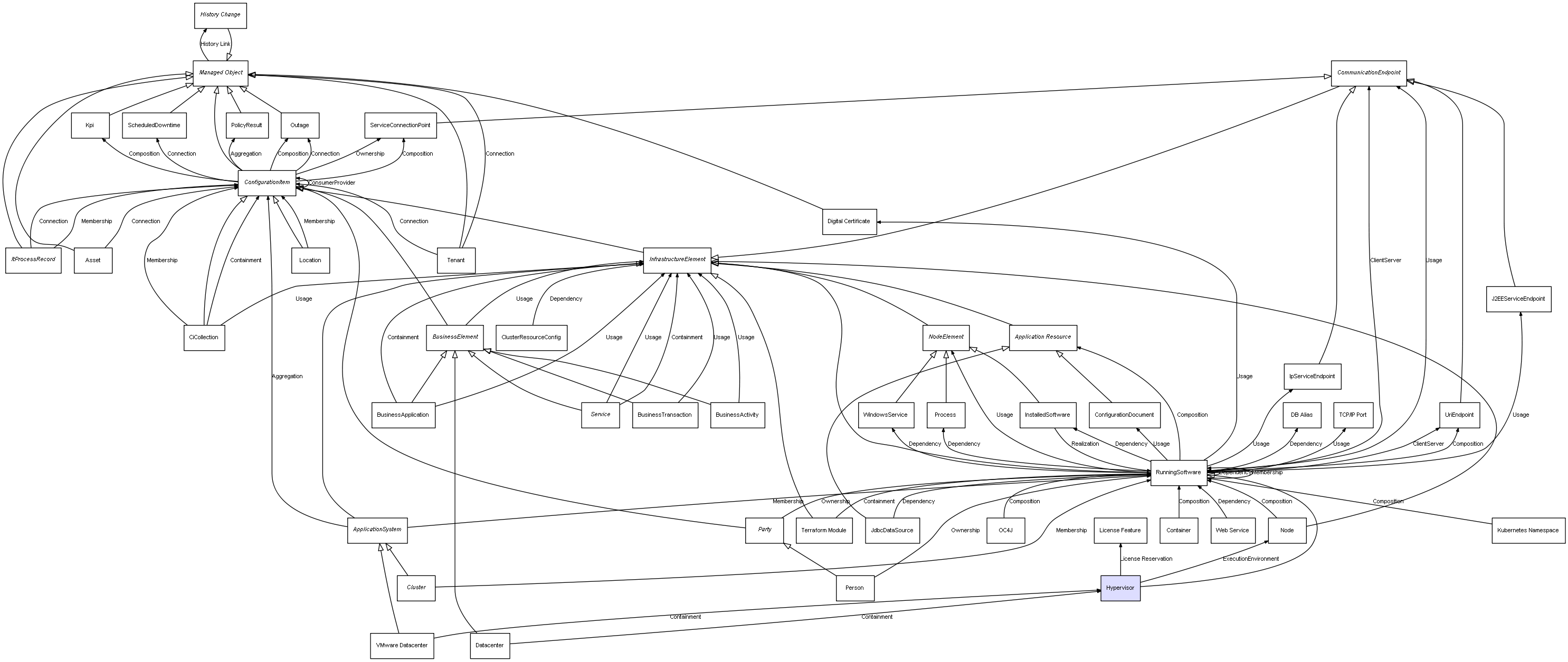 | ConfigurationItem | ServiceConnectionPoint | Composition | Represents a relation between 2 objects where one is contained within the other, and the included object can not exist without its container. Therefore, when the container is deleted, all its contained object will be automatically removed |