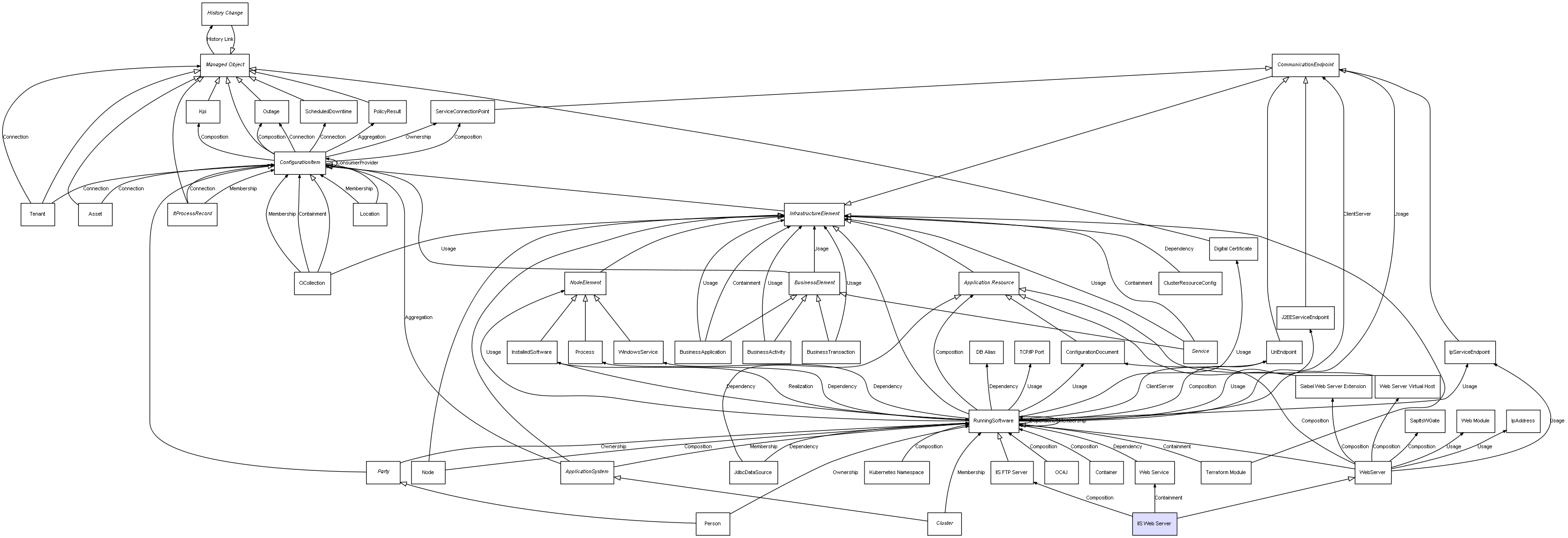 | ConfigurationItem | ServiceConnectionPoint | Composition | Represents a relation between 2 objects where one is contained within the other, and the included object can not exist without its container. Therefore, when the container is deleted, all its contained object will be automatically removed |
