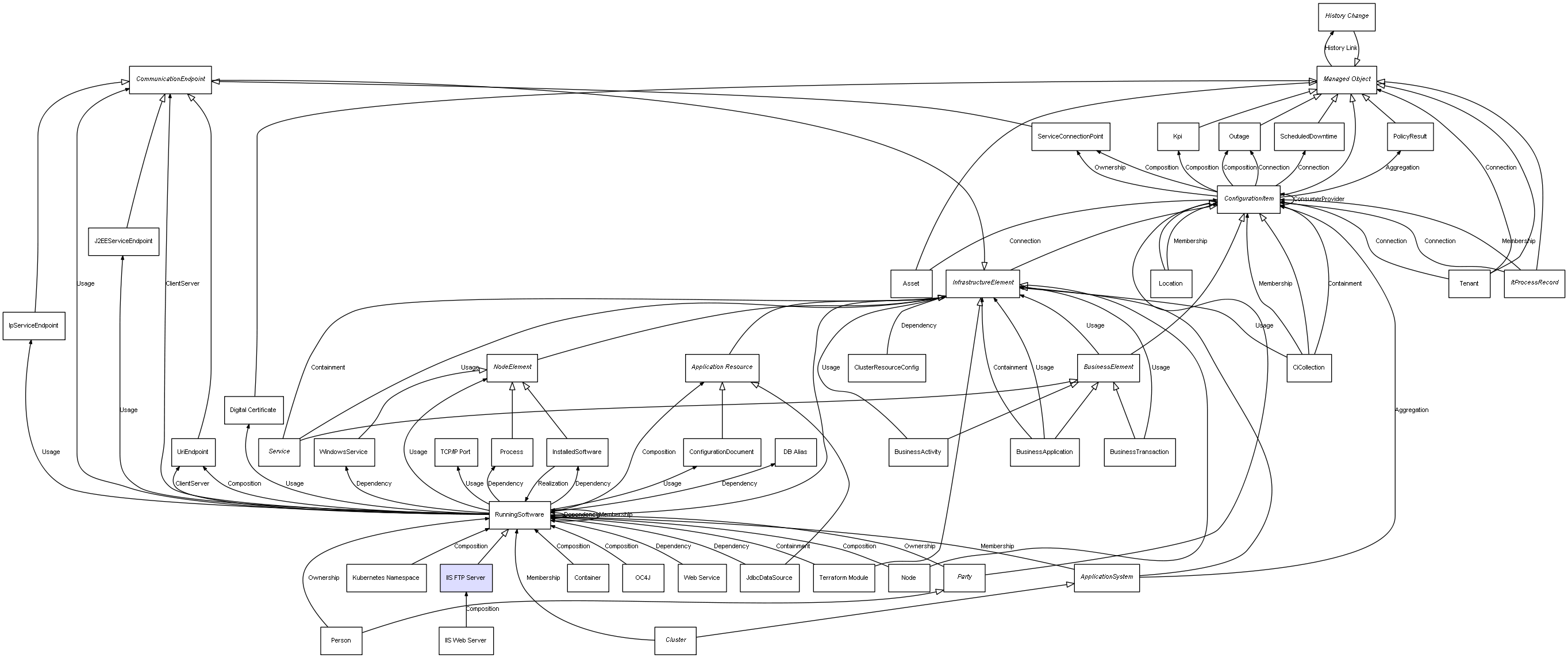 | ConfigurationItem | ServiceConnectionPoint | Composition | Represents a relation between 2 objects where one is contained within the other, and the included object can not exist without its container. Therefore, when the container is deleted, all its contained object will be automatically removed |