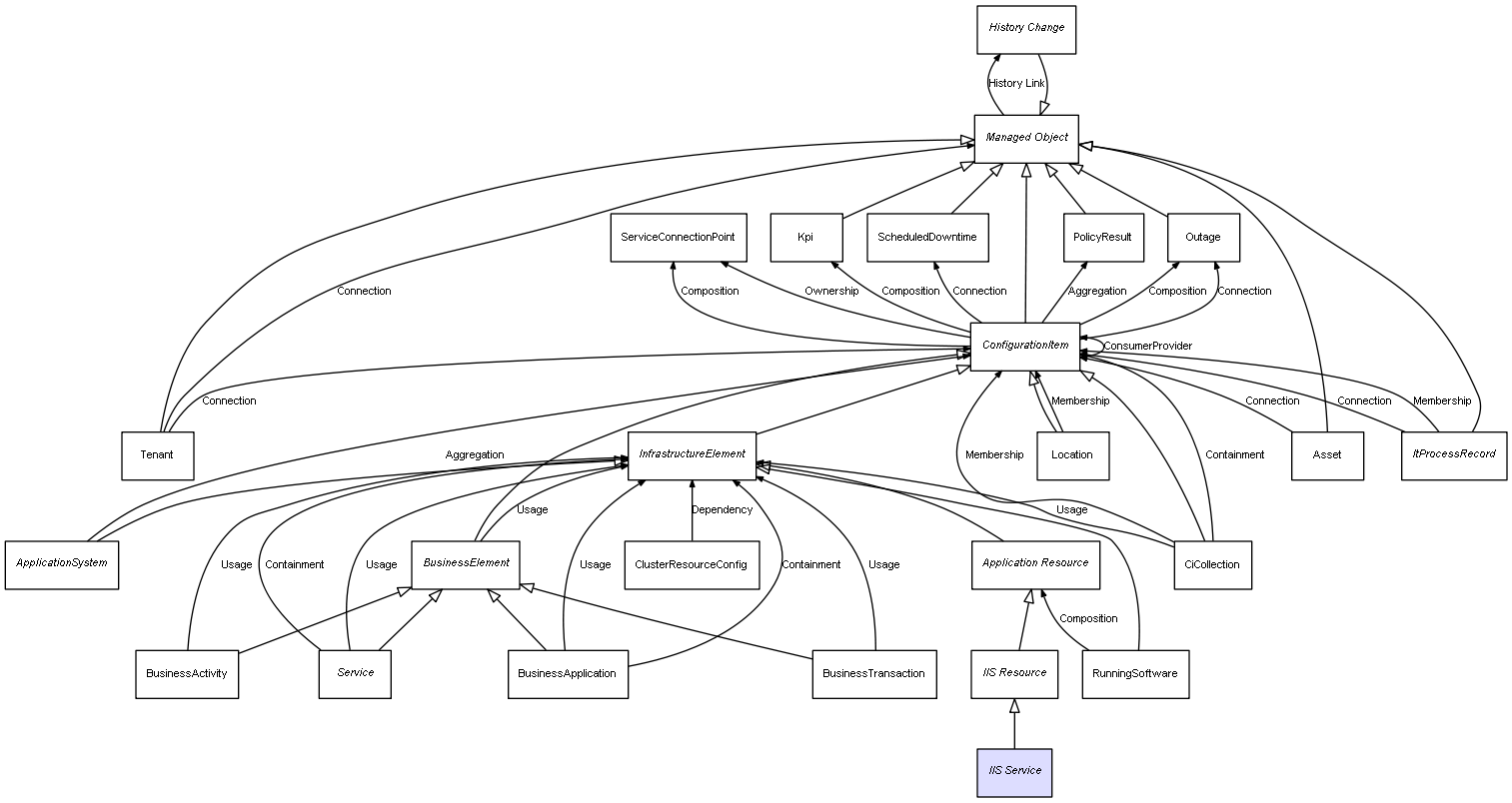 | ConfigurationItem | ServiceConnectionPoint | Composition | Represents a relation between 2 objects where one is contained within the other, and the included object can not exist without its container. Therefore, when the container is deleted, all its contained object will be automatically removed |