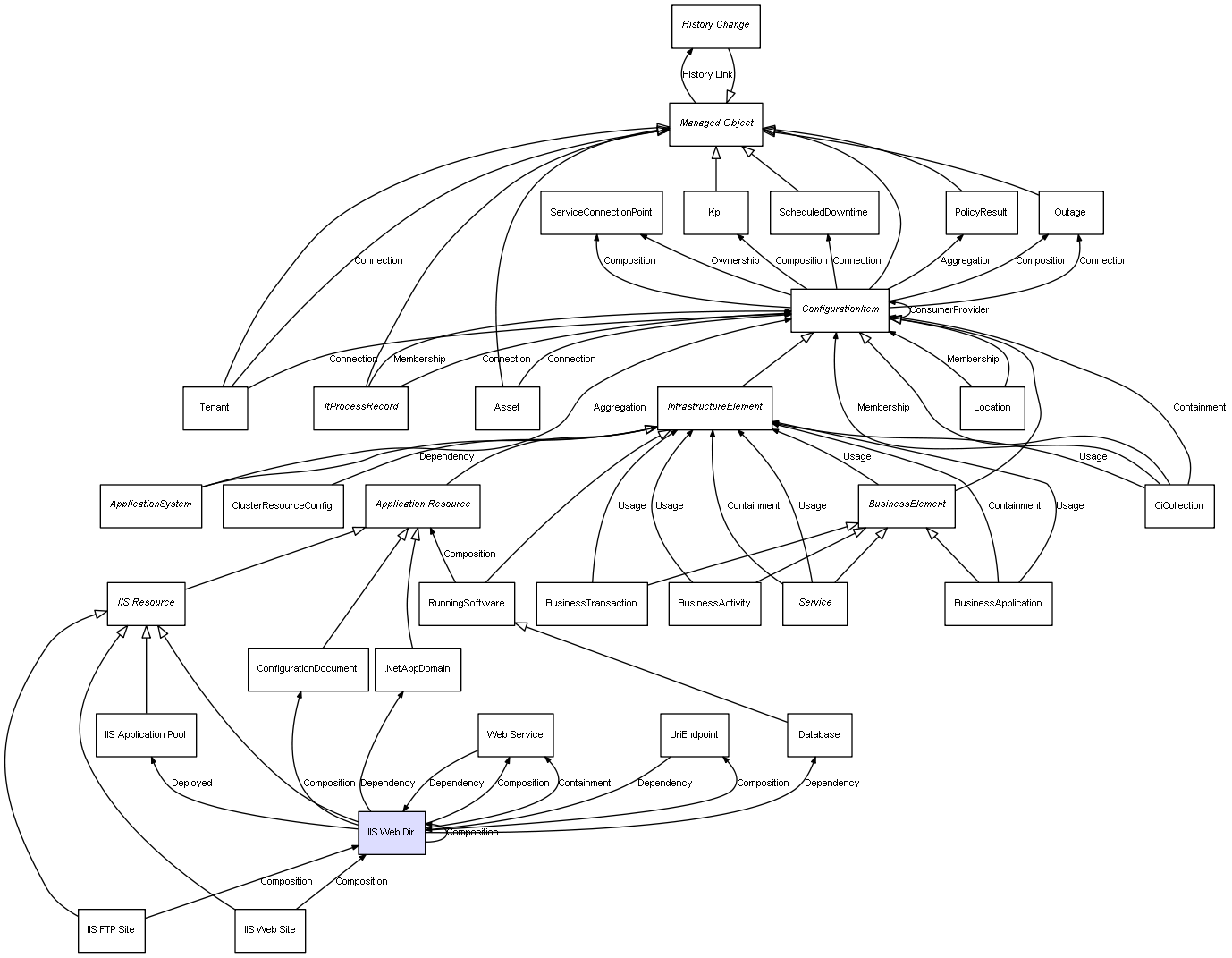 | IIS Web Dir | IIS Web Dir | Composition | Represents a relation between 2 objects where one is contained within the other, and the included object can not exist without its container. Therefore, when the container is deleted, all its contained object will be automatically removed |