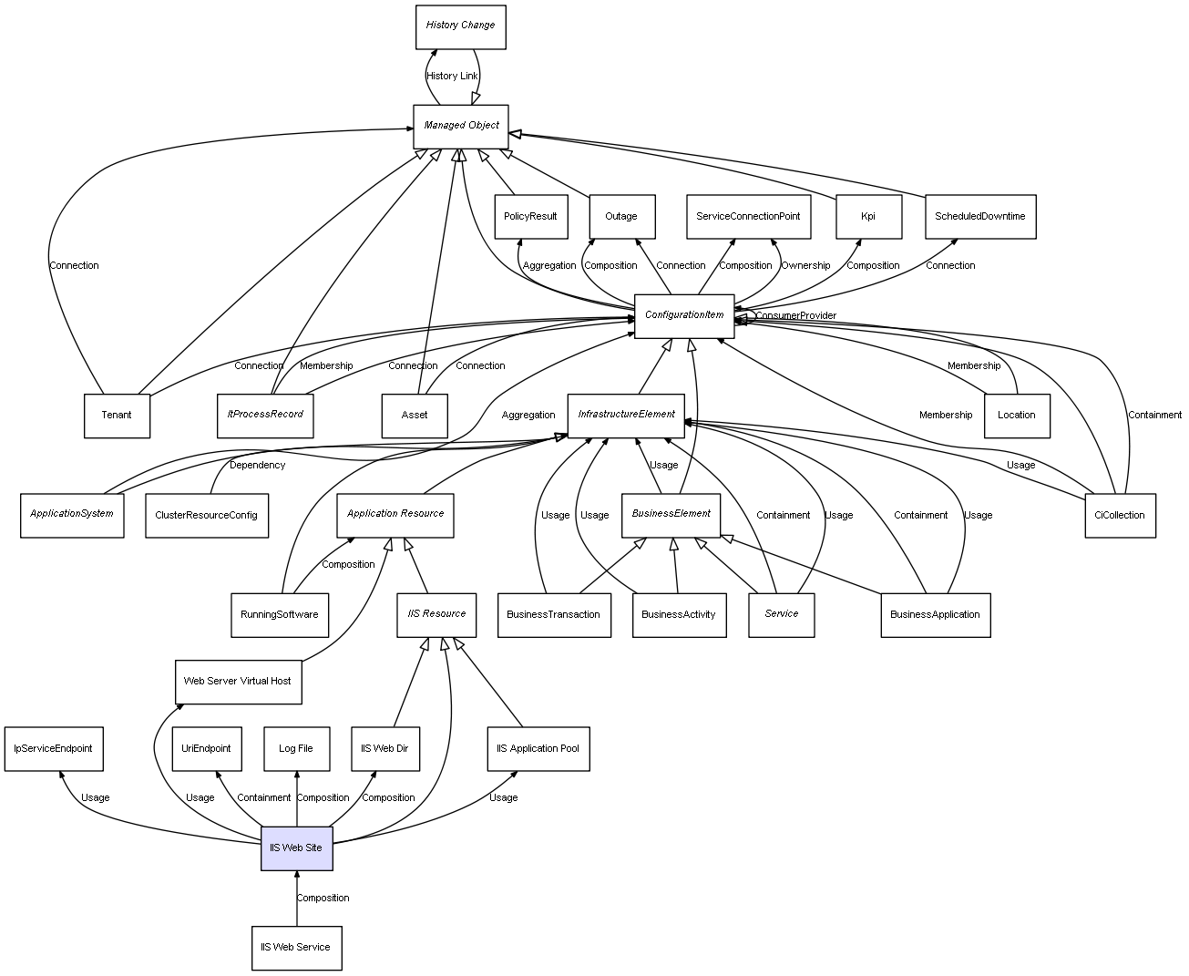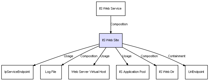| IIS Web Service | IIS Web Site | Composition | Represents a relation between 2 objects where one is contained within the other, and the included object can not exist without its container. Therefore, when the container is deleted, all its contained object will be automatically removed |
