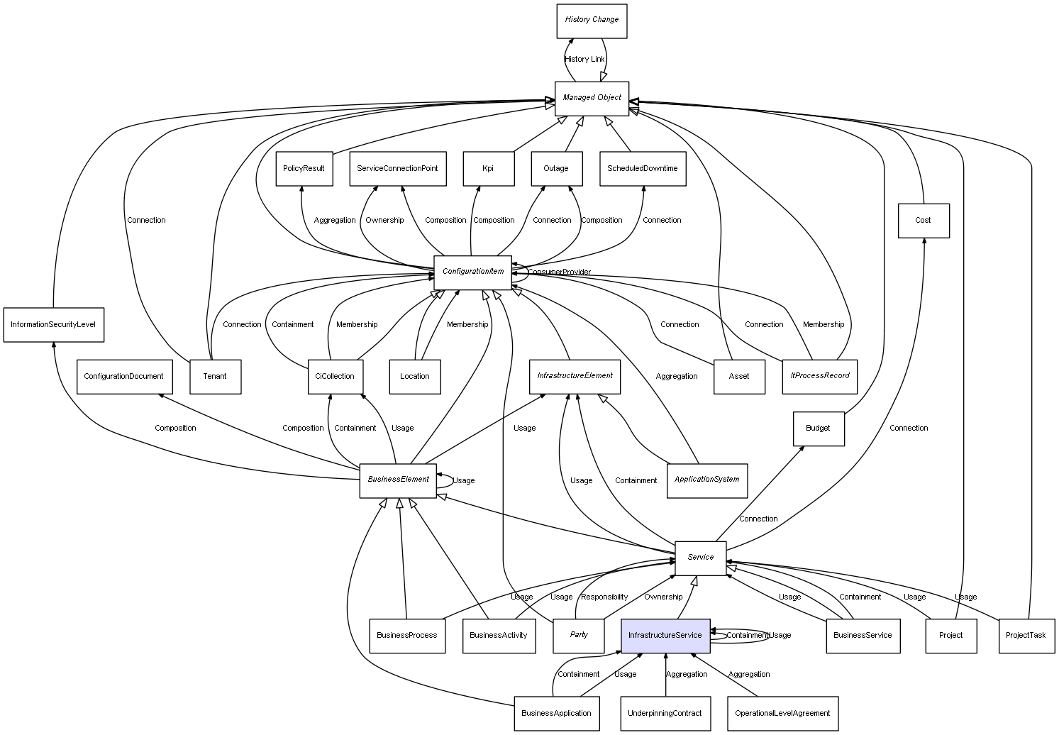 | ConfigurationItem | ServiceConnectionPoint | Composition | Represents a relation between 2 objects where one is contained within the other, and the included object can not exist without its container. Therefore, when the container is deleted, all its contained object will be automatically removed |