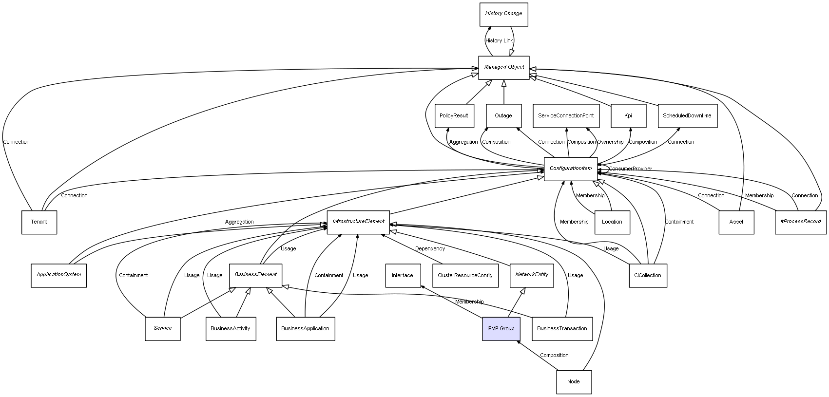 | ConfigurationItem | Outage | Composition | Represents a relation between 2 objects where one is contained within the other, and the included object can not exist without its container. Therefore, when the container is deleted, all its contained object will be automatically removed |
