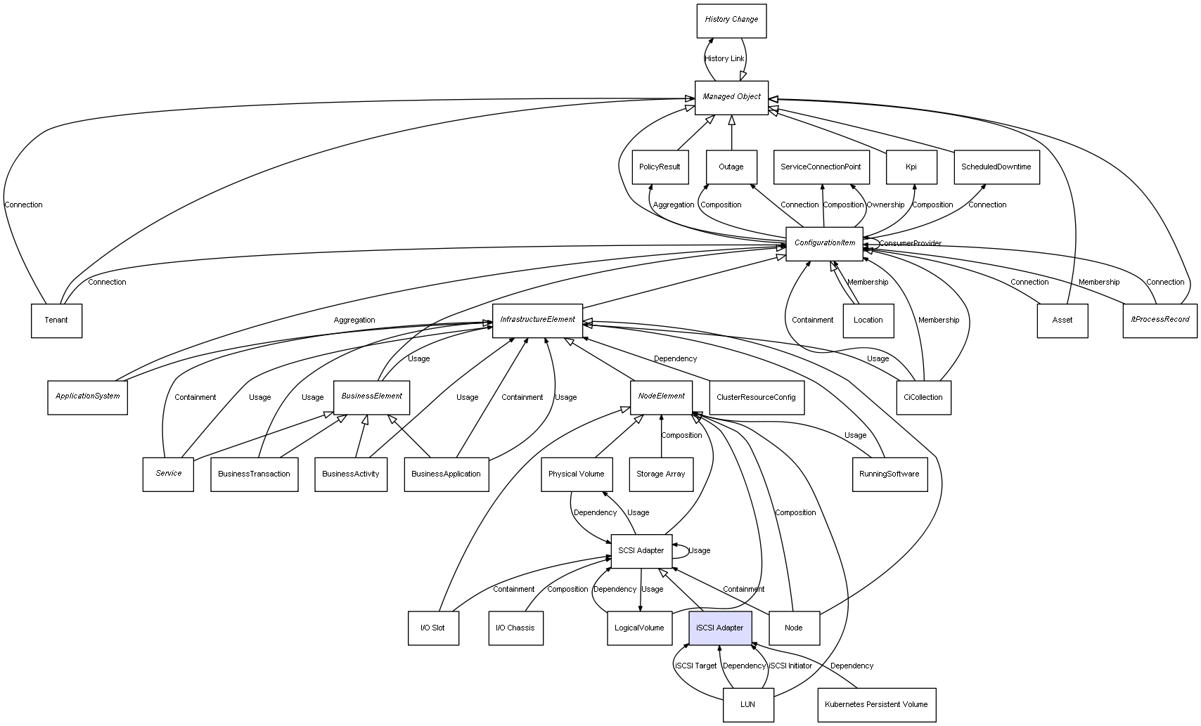 | LUN | iSCSI Adapter | Dependency | represents a dependency between 2 objects |