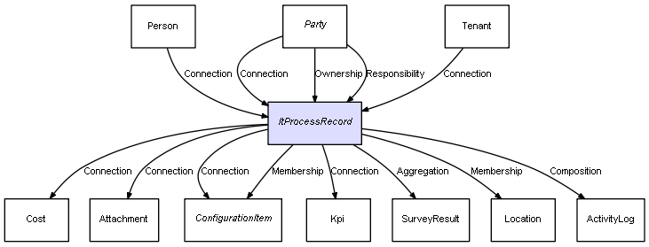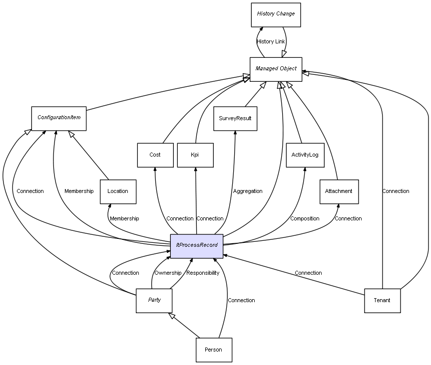 | ItProcessRecord | ActivityLog | Composition | Represents a relation between 2 objects where one is contained within the other, and the included object can not exist without its container. Therefore, when the container is deleted, all its contained object will be automatically removed |