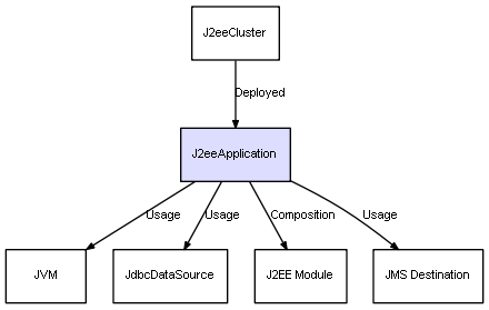 | J2eeApplication | J2EE Module | Composition | Represents a relation between 2 objects where one is contained within the other, and the included object can not exist without its container. Therefore, when the container is deleted, all its contained object will be automatically removed |
