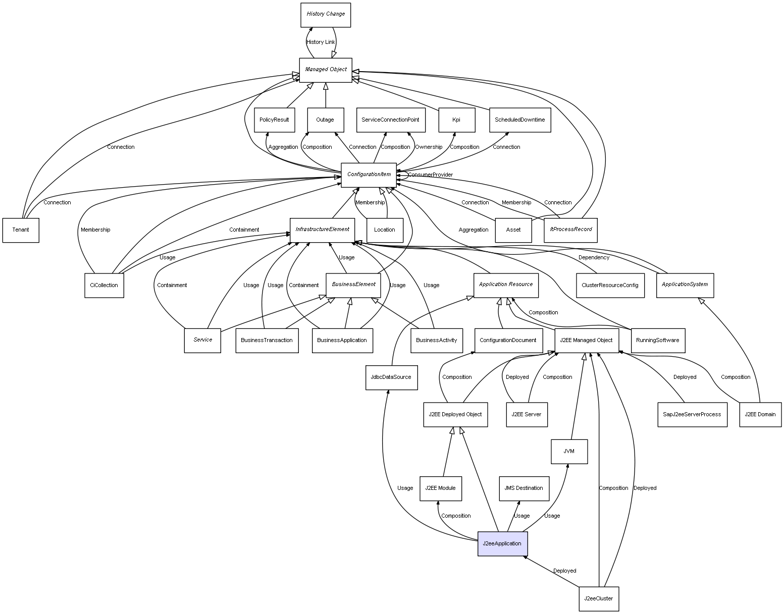 | J2eeCluster | J2EE Managed Object | Composition | Represents a relation between 2 objects where one is contained within the other, and the included object can not exist without its container. Therefore, when the container is deleted, all its contained object will be automatically removed |