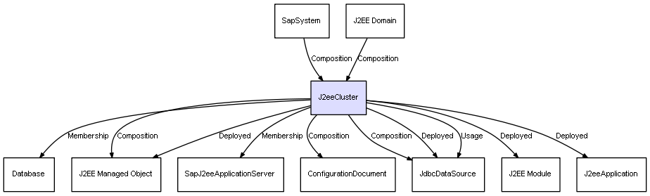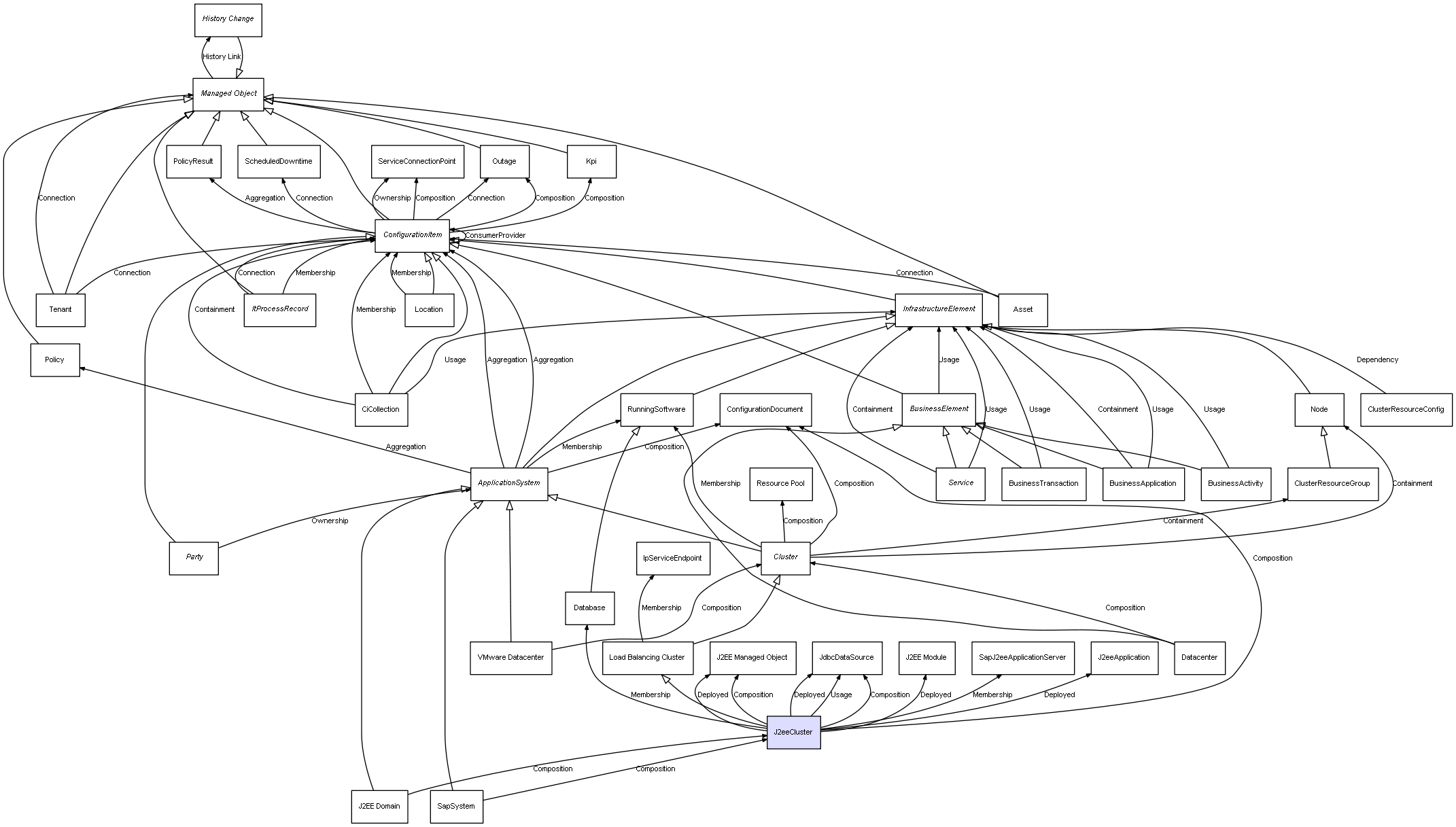 | VMware Datacenter | Cluster | Composition | Represents a relation between 2 objects where one is contained within the other, and the included object can not exist without its container. Therefore, when the container is deleted, all its contained object will be automatically removed |