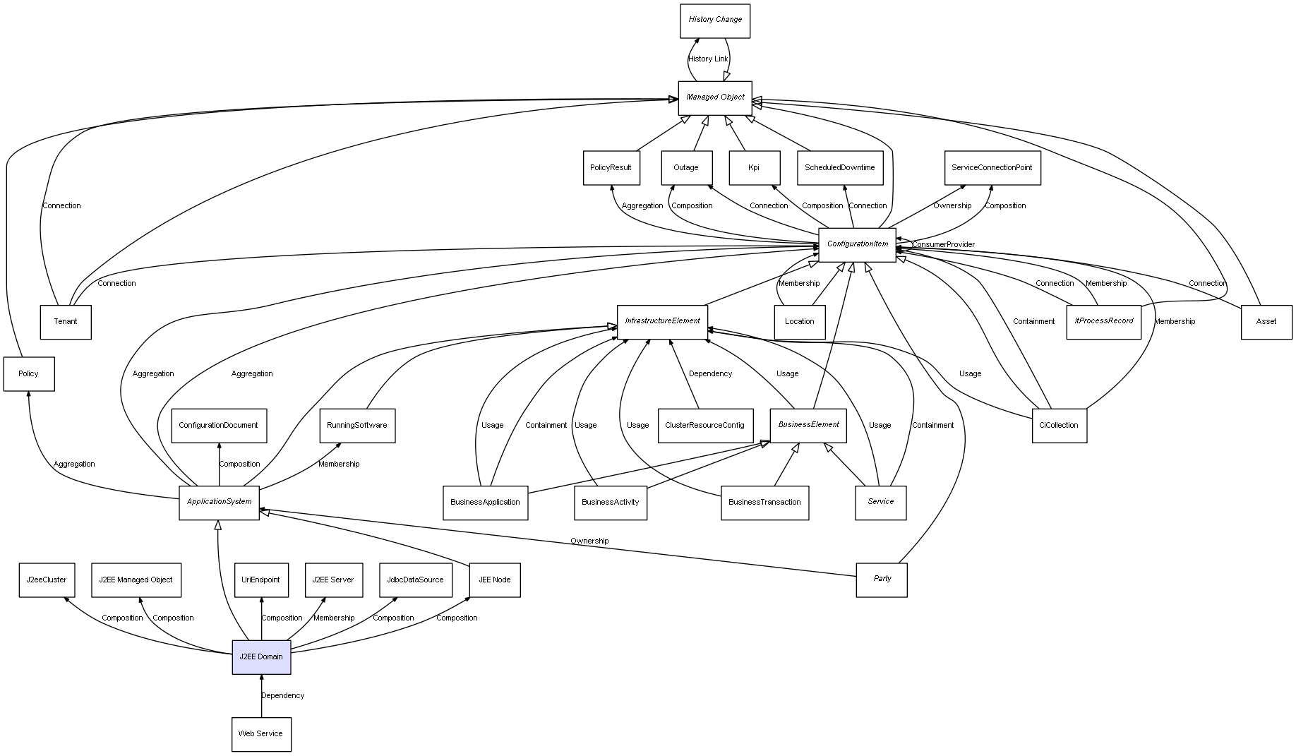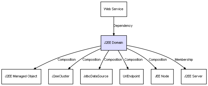 | J2EE Domain | J2EE Managed Object | Composition | Represents a relation between 2 objects where one is contained within the other, and the included object can not exist without its container. Therefore, when the container is deleted, all its contained object will be automatically removed |