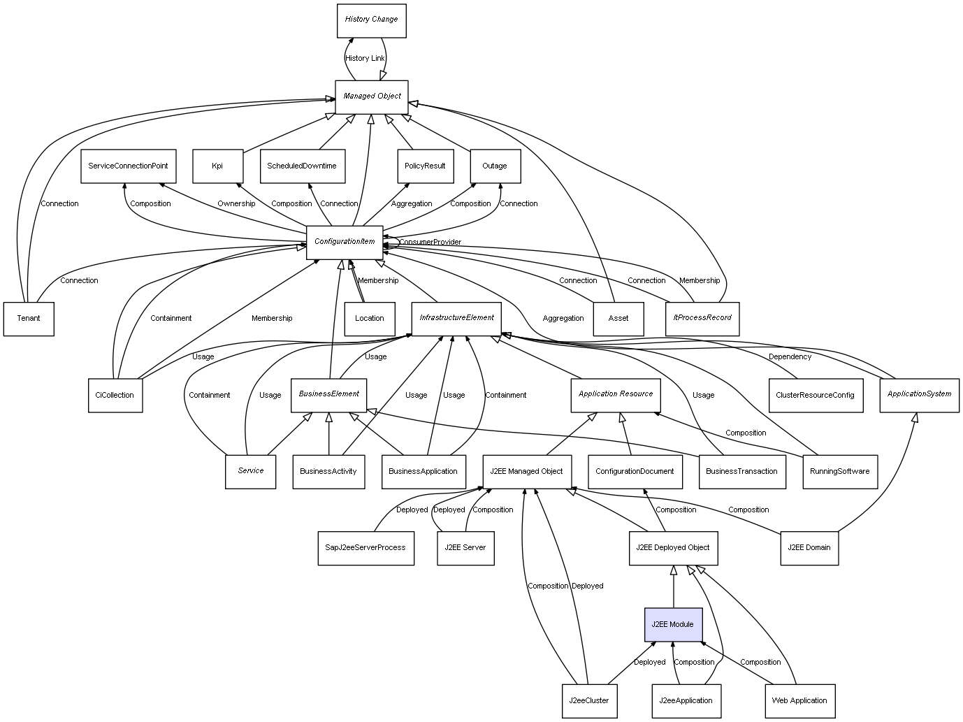 | J2EE Server | J2EE Managed Object | Composition | Represents a relation between 2 objects where one is contained within the other, and the included object can not exist without its container. Therefore, when the container is deleted, all its contained object will be automatically removed |
