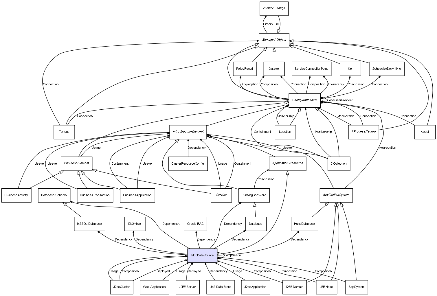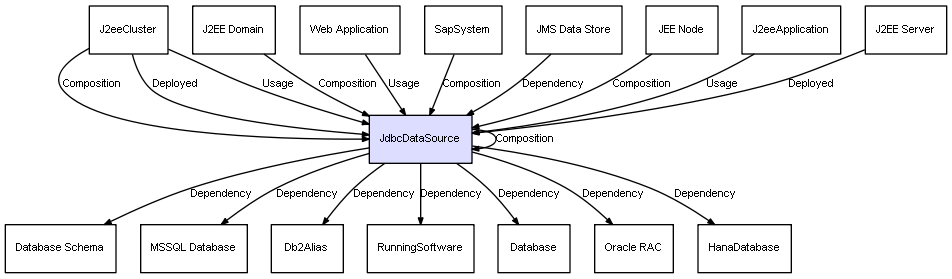 | SapSystem | JdbcDataSource | Composition | Represents a relation between 2 objects where one is contained within the other, and the included object can not exist without its container. Therefore, when the container is deleted, all its contained object will be automatically removed |