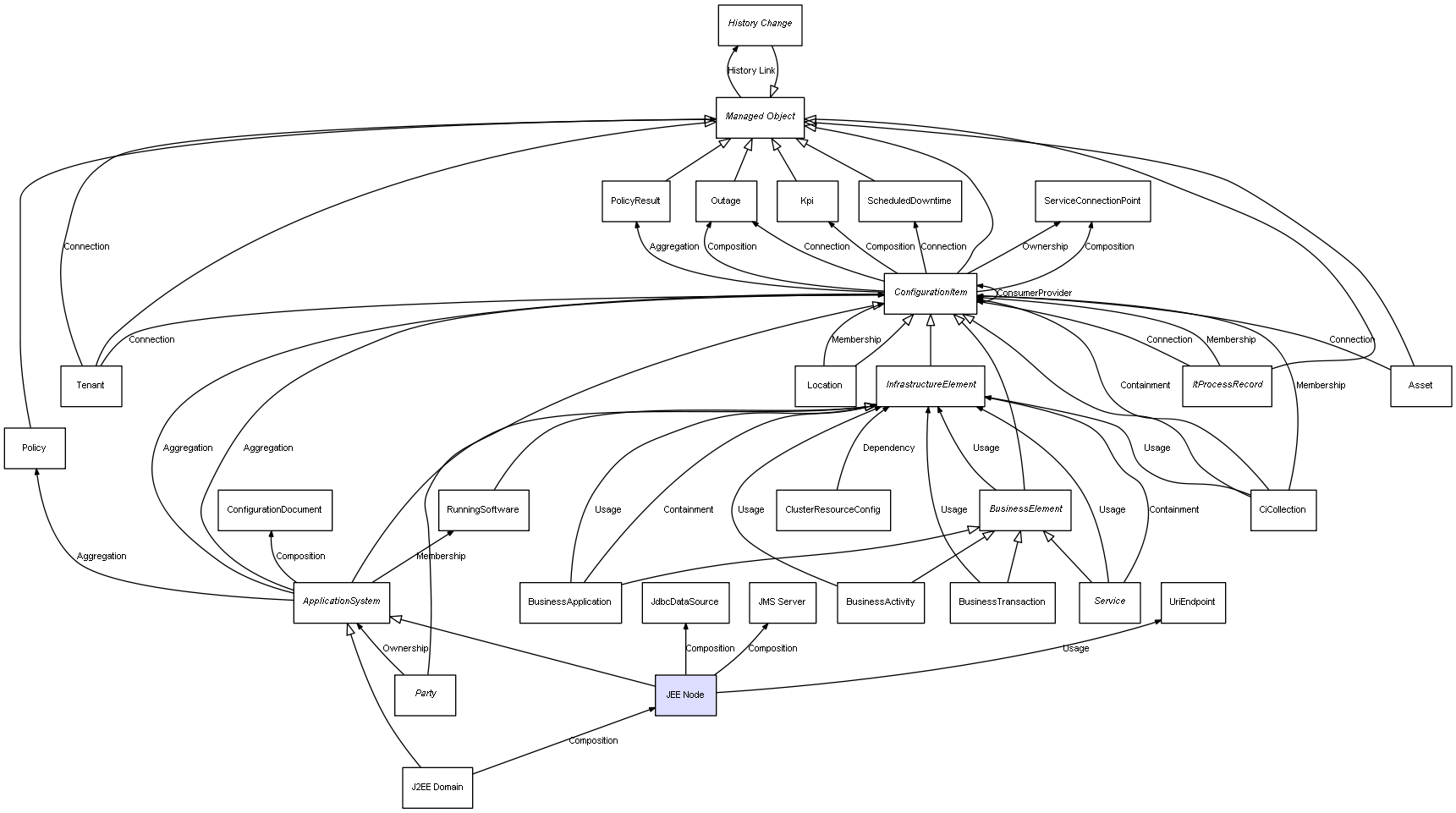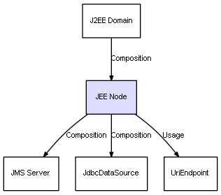 | JEE Node | JMS Server | Composition | Represents a relation between 2 objects where one is contained within the other, and the included object can not exist without its container. Therefore, when the container is deleted, all its contained object will be automatically removed |