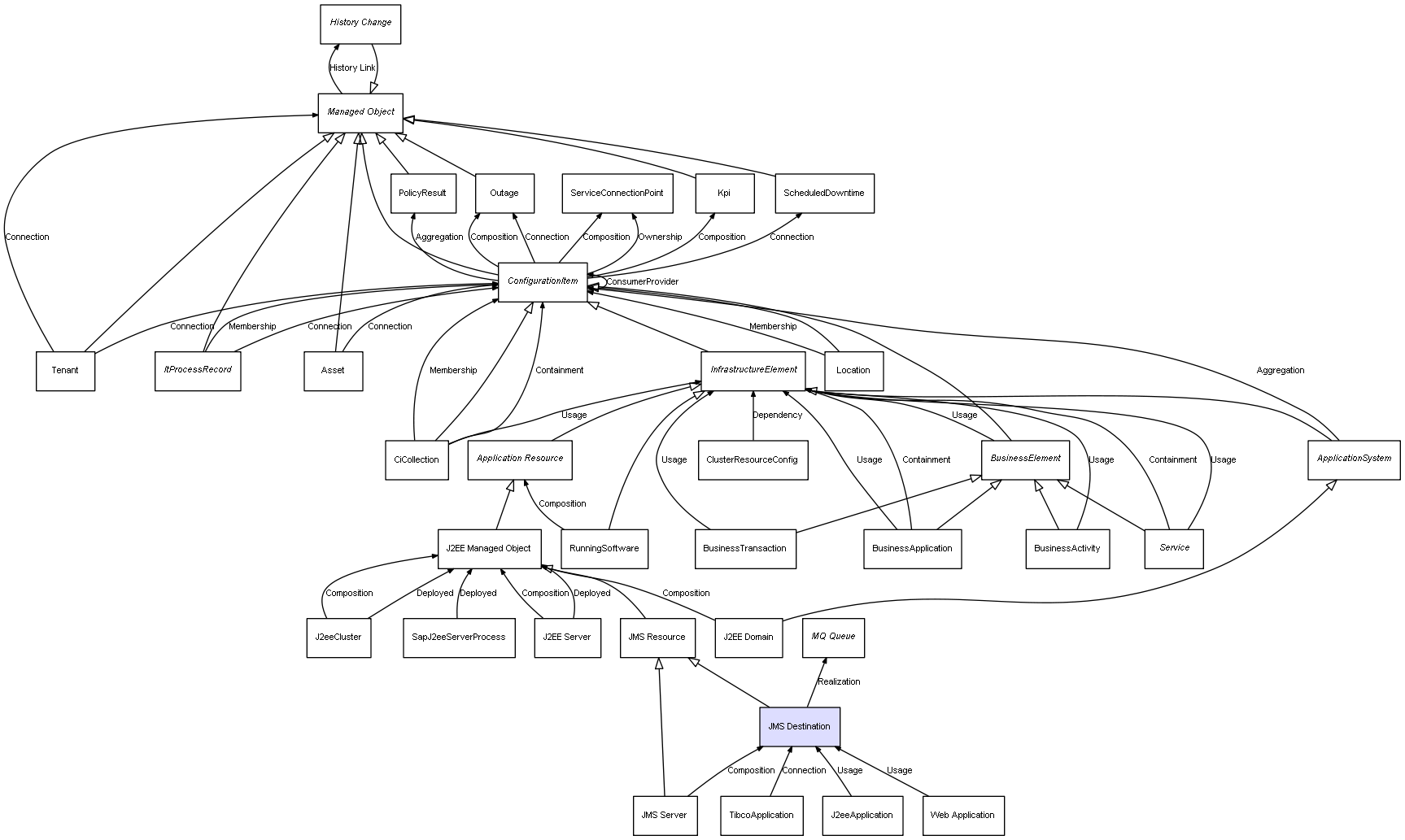 | JMS Server | JMS Destination | Composition | Represents a relation between 2 objects where one is contained within the other, and the included object can not exist without its container. Therefore, when the container is deleted, all its contained object will be automatically removed |