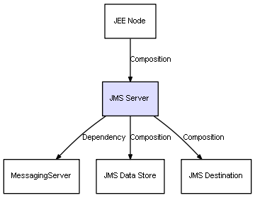 | JMS Server | JMS Data Store | Composition | Represents a relation between 2 objects where one is contained within the other, and the included object can not exist without its container. Therefore, when the container is deleted, all its contained object will be automatically removed |