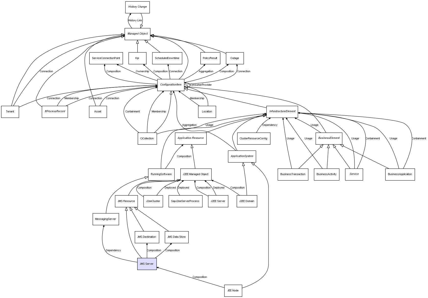 | JMS Server | JMS Destination | Composition | Represents a relation between 2 objects where one is contained within the other, and the included object can not exist without its container. Therefore, when the container is deleted, all its contained object will be automatically removed |