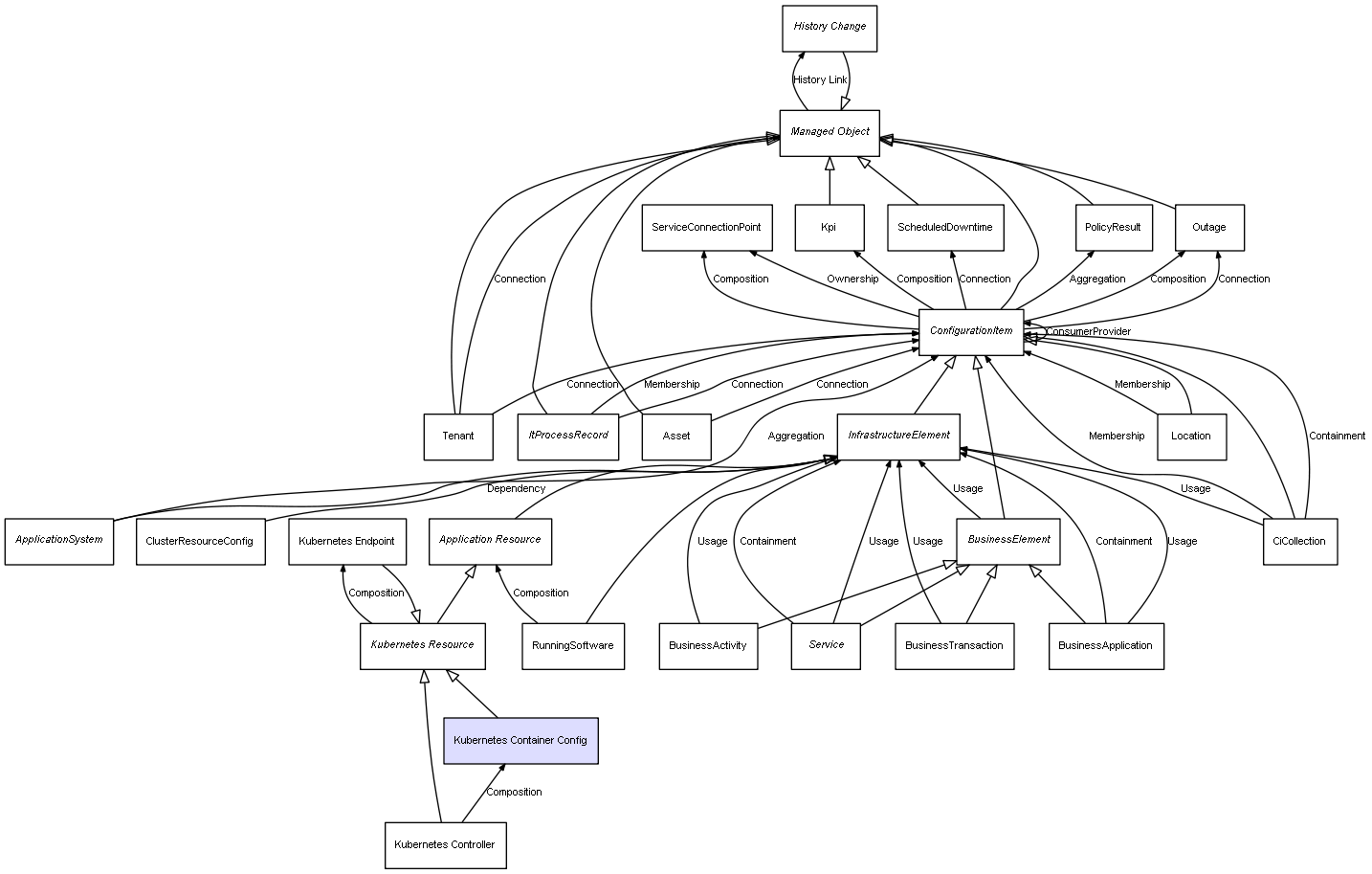 | ConfigurationItem | ServiceConnectionPoint | Composition | Represents a relation between 2 objects where one is contained within the other, and the included object can not exist without its container. Therefore, when the container is deleted, all its contained object will be automatically removed |