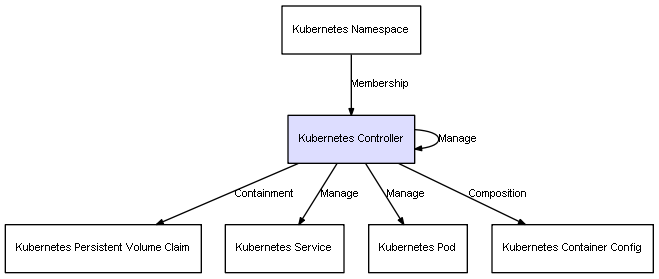 | Kubernetes Controller | Kubernetes Container Config | Composition | Represents a relation between 2 objects where one is contained within the other, and the included object can not exist without its container. Therefore, when the container is deleted, all its contained object will be automatically removed |