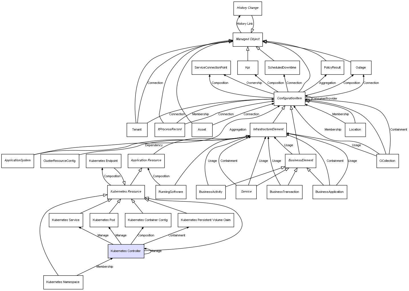 | ConfigurationItem | ServiceConnectionPoint | Composition | Represents a relation between 2 objects where one is contained within the other, and the included object can not exist without its container. Therefore, when the container is deleted, all its contained object will be automatically removed |