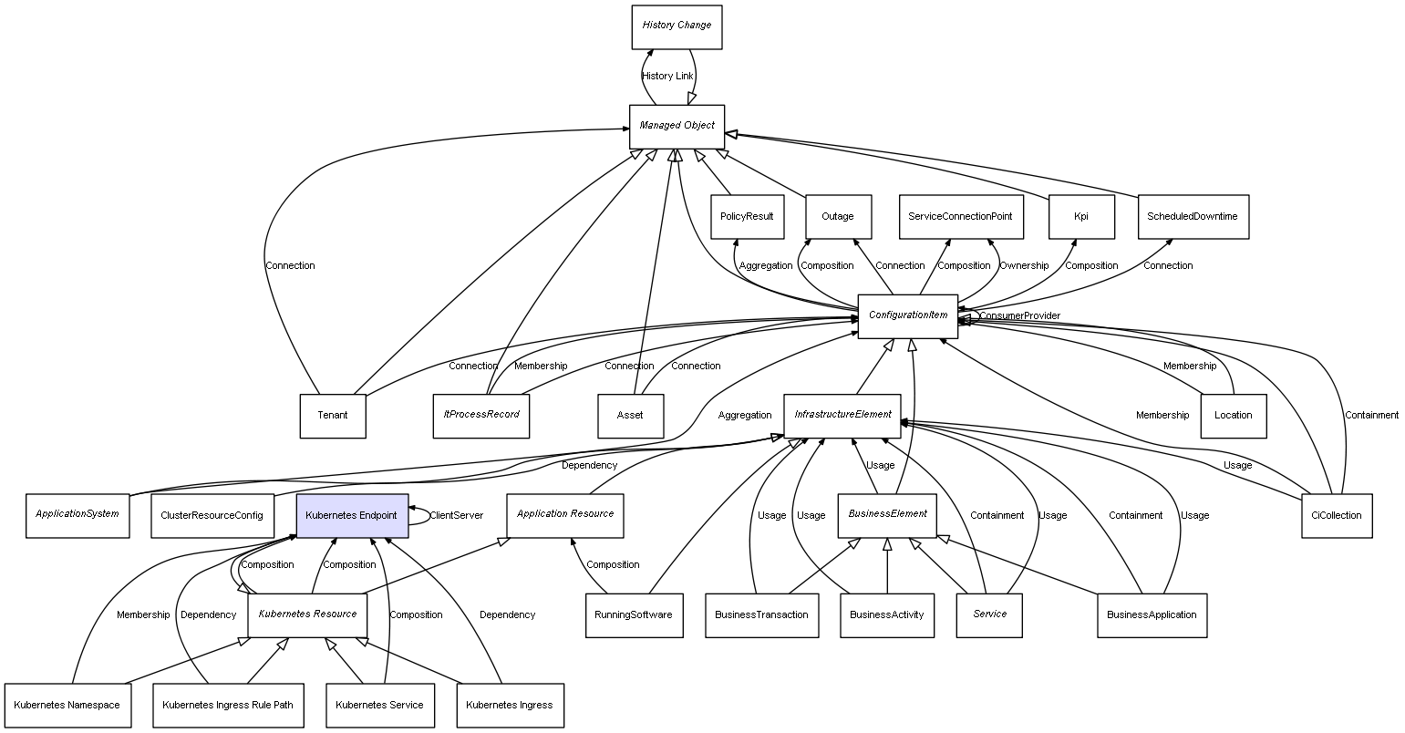 | Kubernetes Endpoint | Kubernetes Endpoint | ClientServer | The Client-Server relationship indicates the two CIs communicate with each other where one CI acts as a client while the other acts a server. |