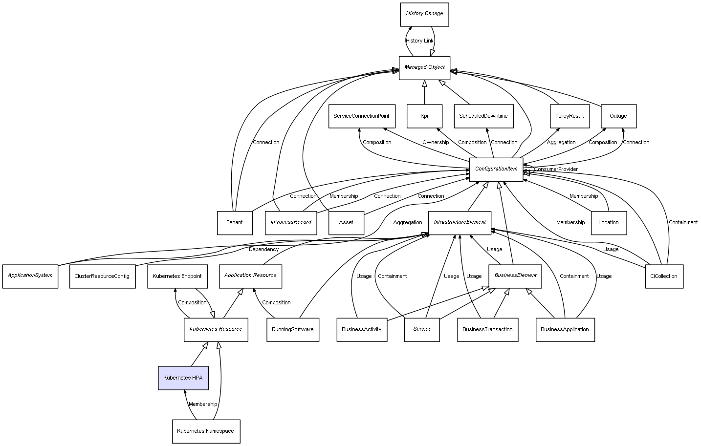 | ConfigurationItem | ServiceConnectionPoint | Composition | Represents a relation between 2 objects where one is contained within the other, and the included object can not exist without its container. Therefore, when the container is deleted, all its contained object will be automatically removed |