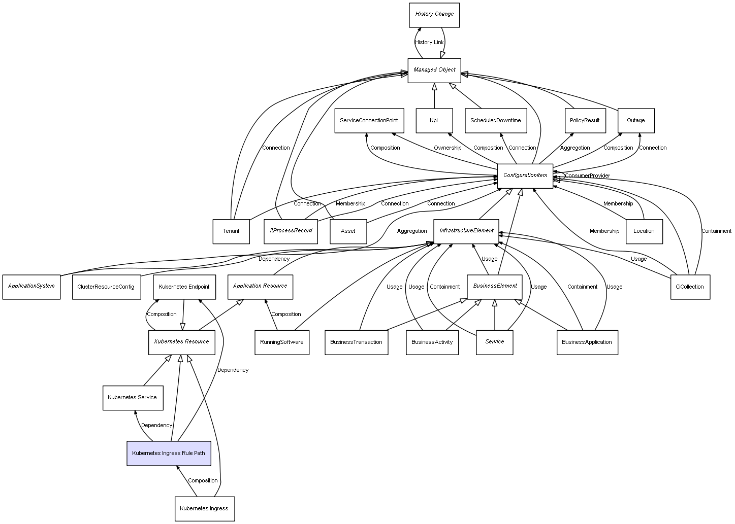 | Kubernetes Ingress | Kubernetes Ingress Rule Path | Composition | Represents a relation between 2 objects where one is contained within the other, and the included object can not exist without its container. Therefore, when the container is deleted, all its contained object will be automatically removed |