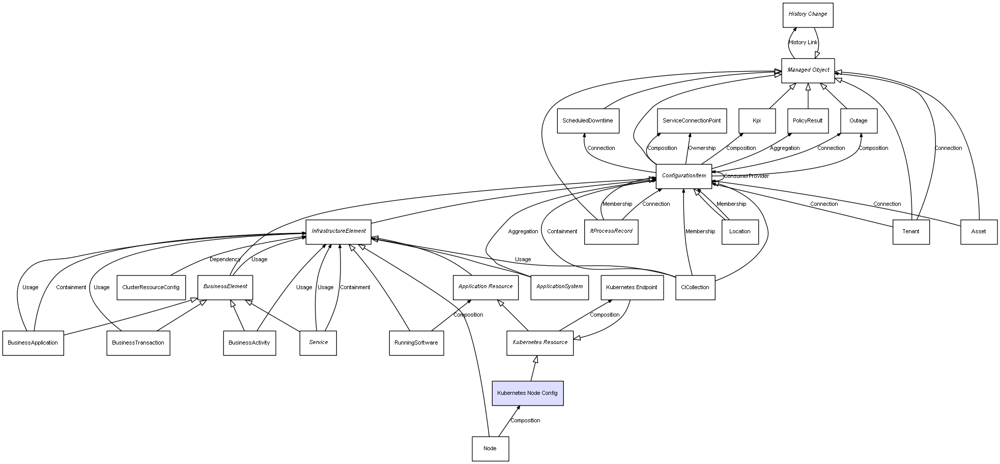 | Node | Kubernetes Node Config | Composition | Represents a relation between 2 objects where one is contained within the other, and the included object can not exist without its container. Therefore, when the container is deleted, all its contained object will be automatically removed |