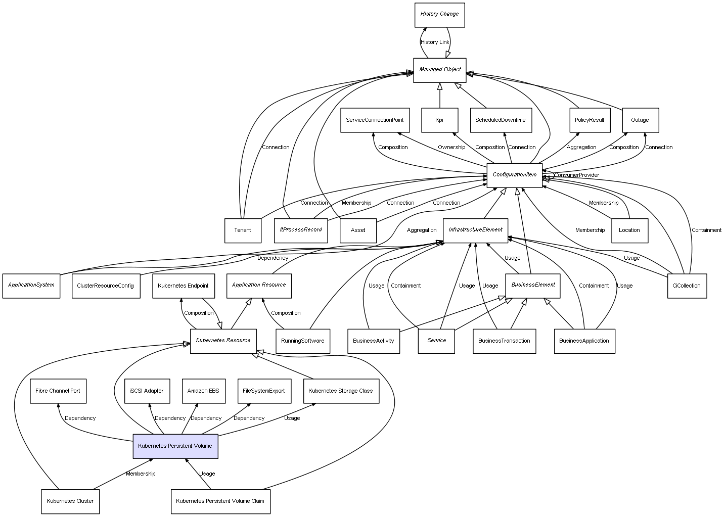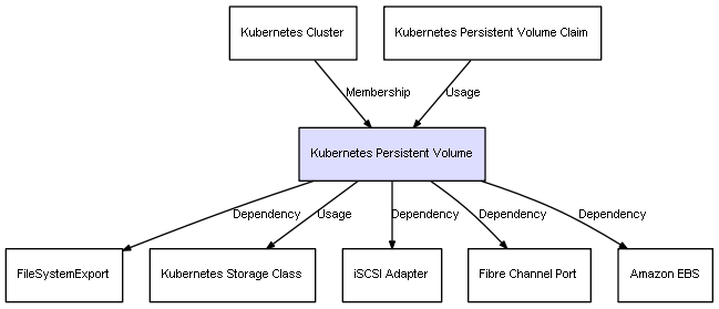 | Kubernetes Persistent Volume | Fibre Channel Port | Dependency | represents a dependency between 2 objects |
