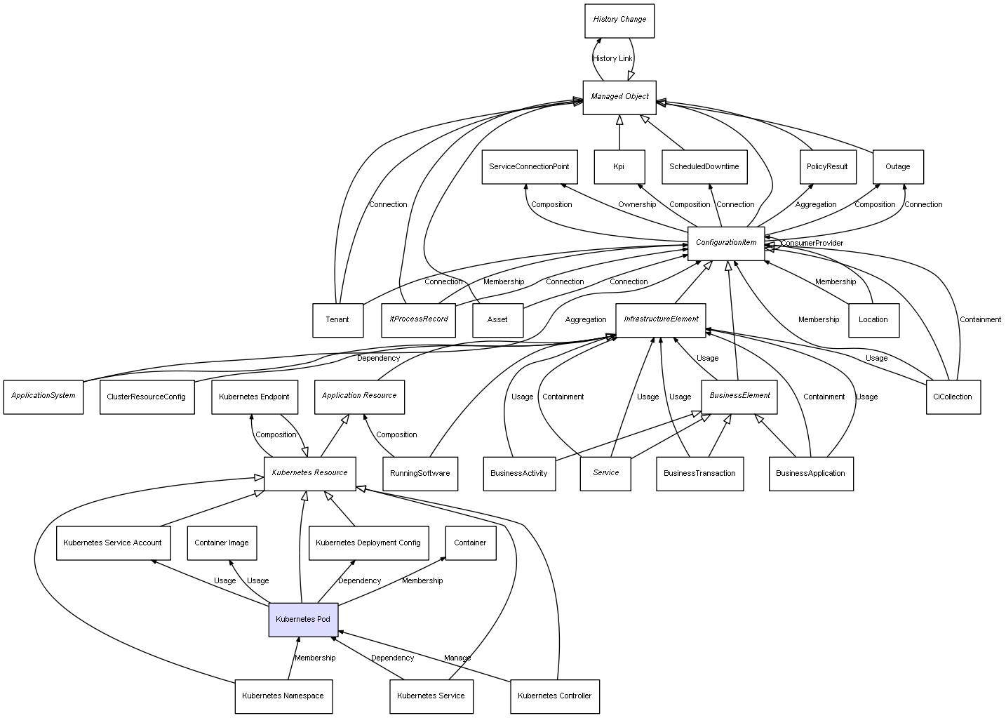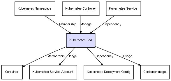 | Kubernetes Pod | Kubernetes Deployment Config | Dependency | represents a dependency between 2 objects |