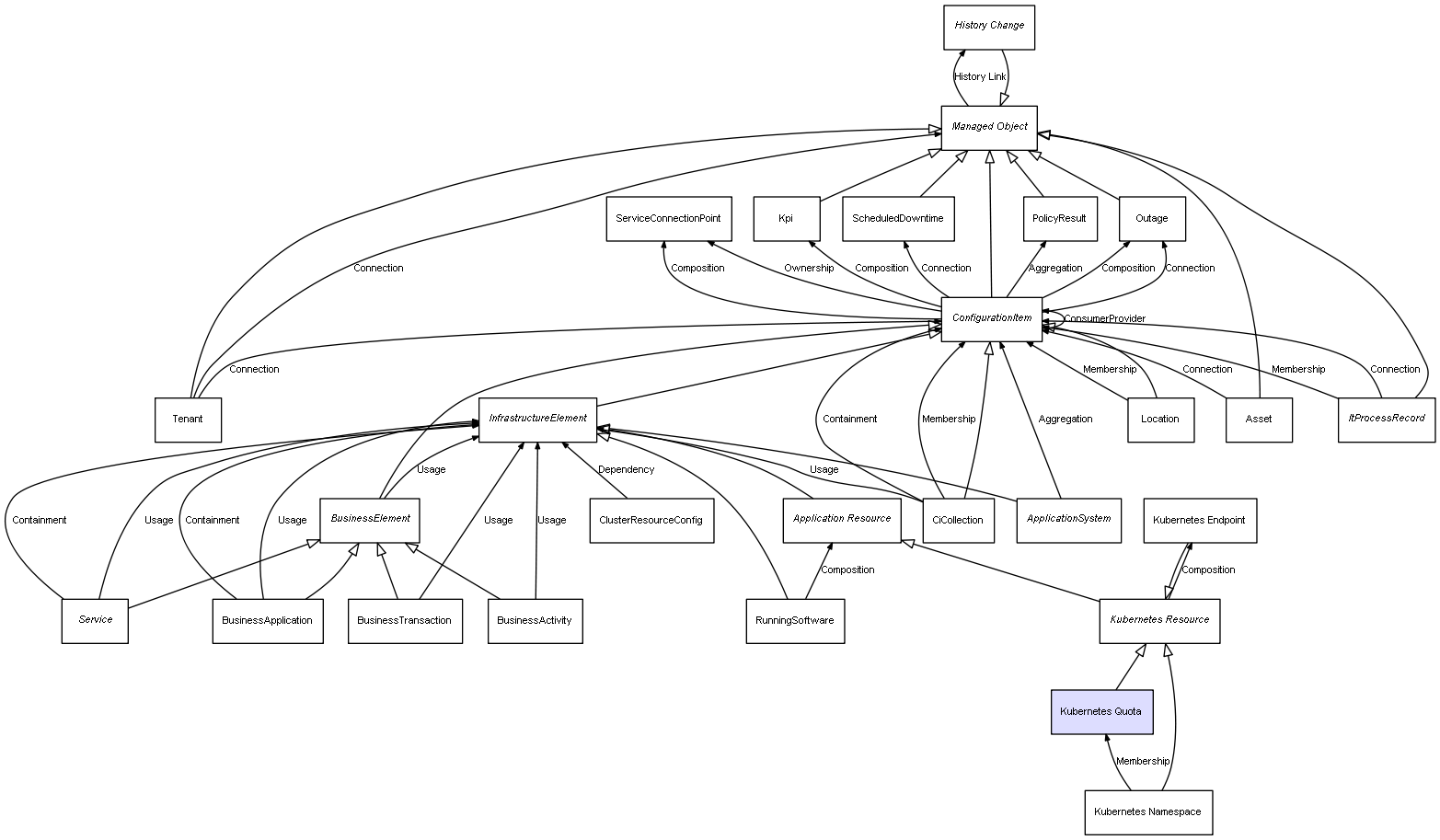 | ConfigurationItem | Outage | Composition | Represents a relation between 2 objects where one is contained within the other, and the included object can not exist without its container. Therefore, when the container is deleted, all its contained object will be automatically removed |