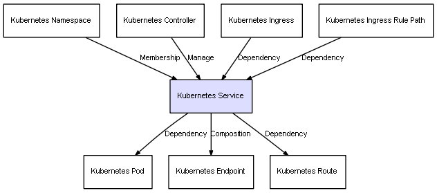 | Kubernetes Service | Kubernetes Endpoint | Composition | Represents a relation between 2 objects where one is contained within the other, and the included object can not exist without its container. Therefore, when the container is deleted, all its contained object will be automatically removed |