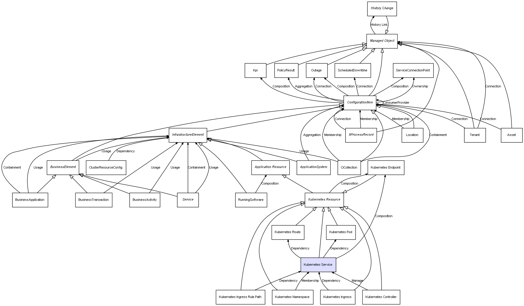 | ConfigurationItem | ServiceConnectionPoint | Composition | Represents a relation between 2 objects where one is contained within the other, and the included object can not exist without its container. Therefore, when the container is deleted, all its contained object will be automatically removed |