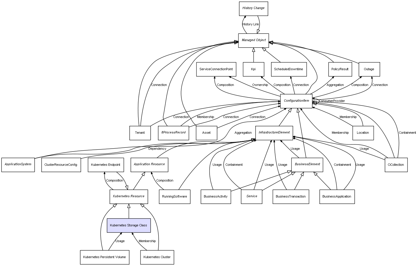 | ConfigurationItem | Outage | Composition | Represents a relation between 2 objects where one is contained within the other, and the included object can not exist without its container. Therefore, when the container is deleted, all its contained object will be automatically removed |