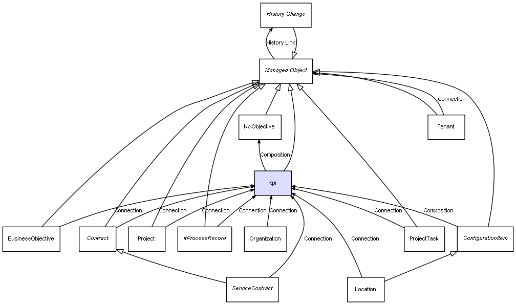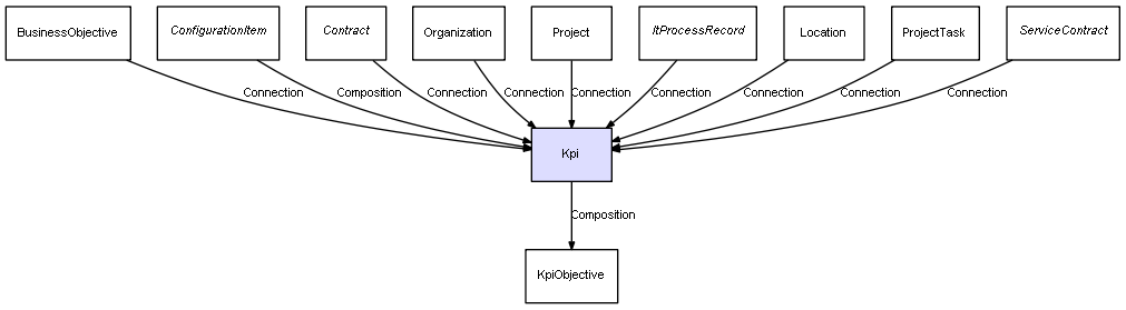 | Kpi | KpiObjective | Composition | Represents a relation between 2 objects where one is contained within the other, and the included object can not exist without its container. Therefore, when the container is deleted, all its contained object will be automatically removed |