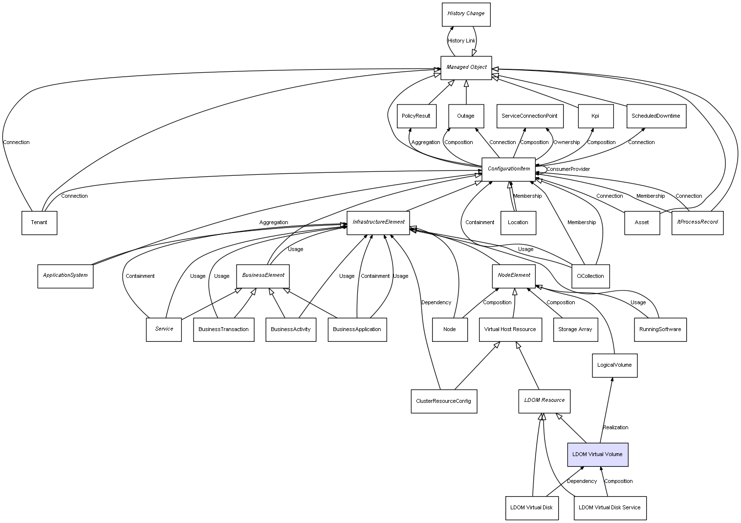 | LDOM Virtual Disk Service | LDOM Virtual Volume | Composition | Represents a relation between 2 objects where one is contained within the other, and the included object can not exist without its container. Therefore, when the container is deleted, all its contained object will be automatically removed |