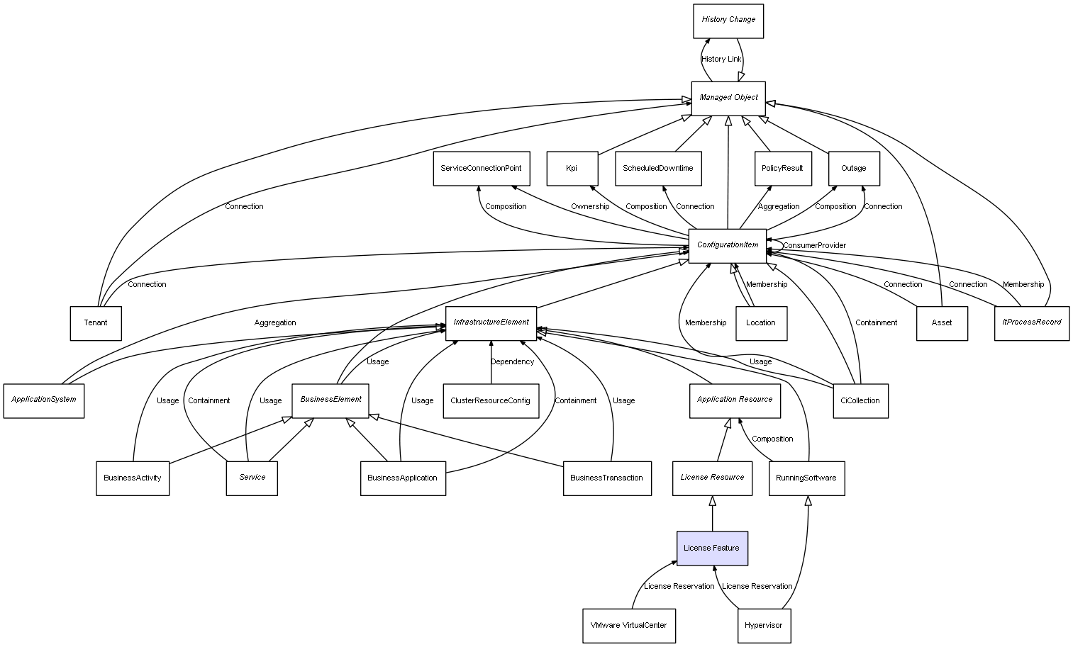 | ConfigurationItem | ServiceConnectionPoint | Composition | Represents a relation between 2 objects where one is contained within the other, and the included object can not exist without its container. Therefore, when the container is deleted, all its contained object will be automatically removed |